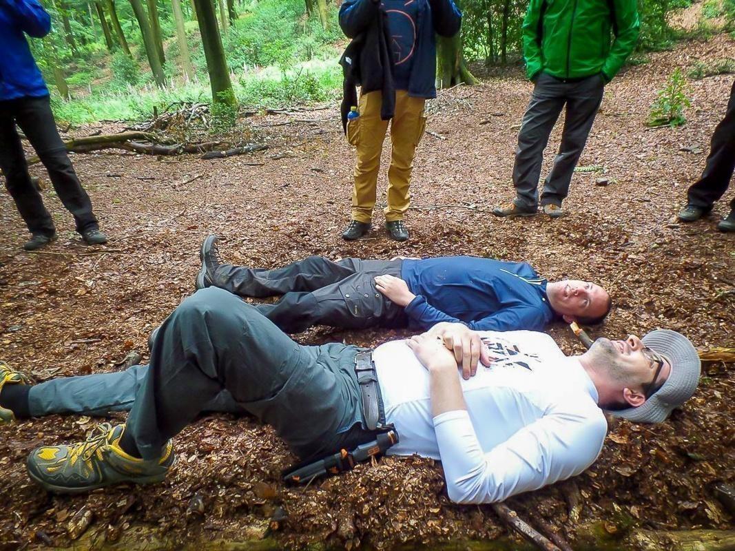 Zwei Personen liegen auf dem Waldboden, umgeben von anderen Teilnehmern