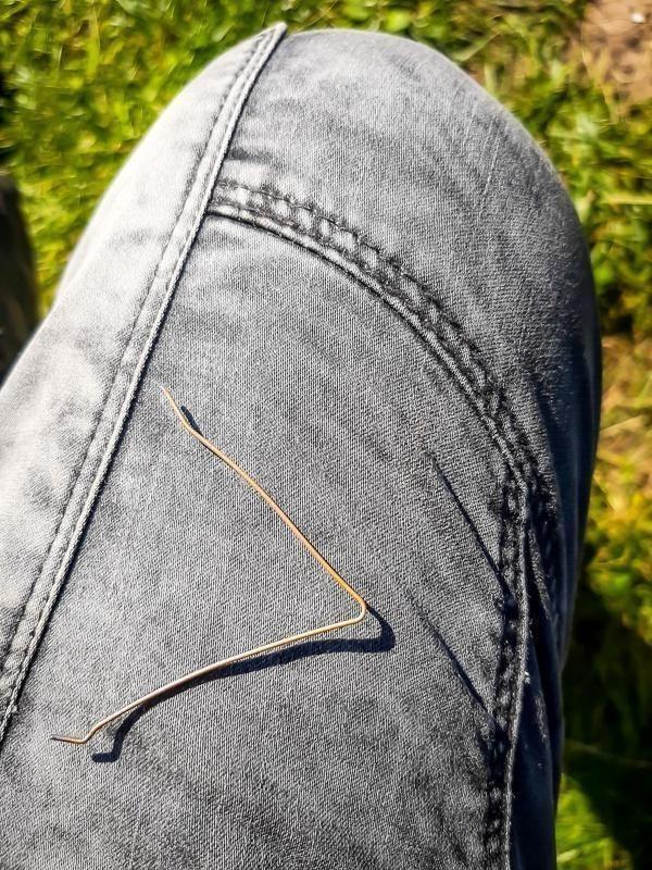 Drahtstück liegt auf grauer Jeanshose im Gras