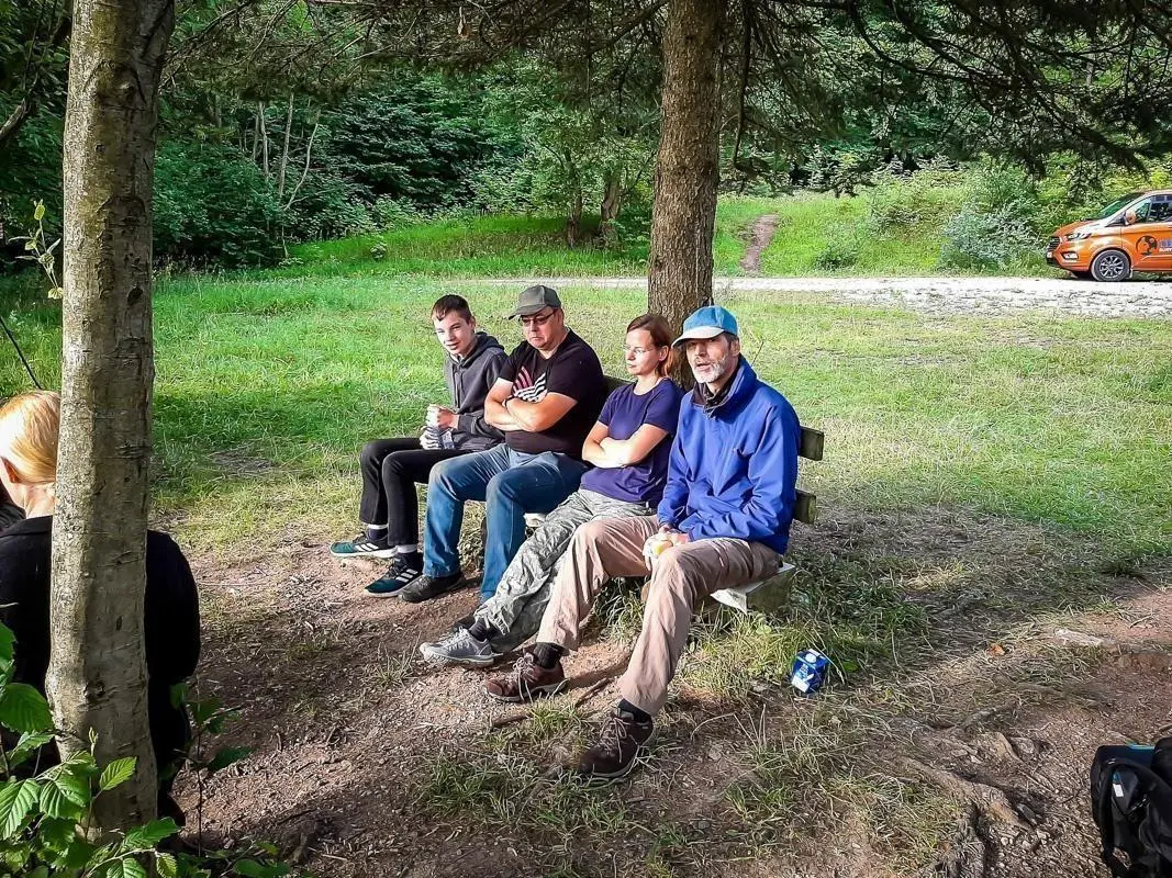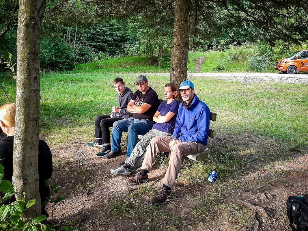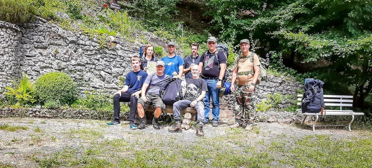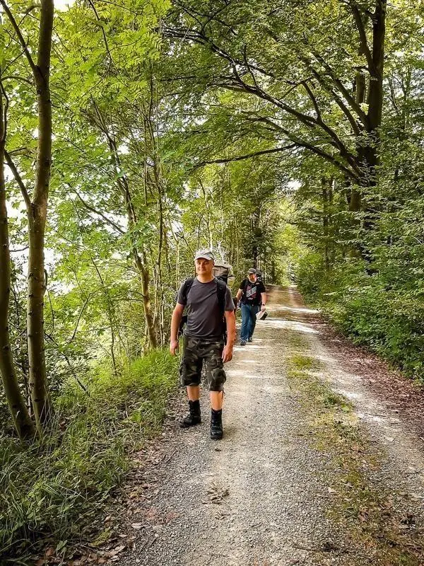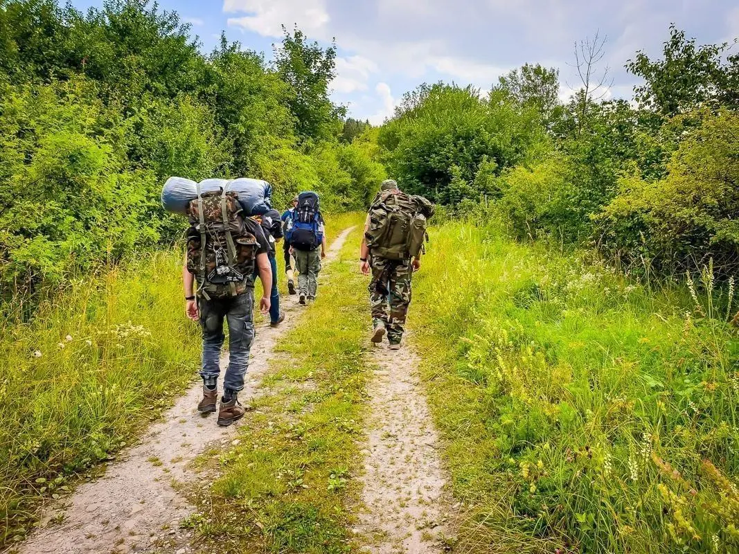 Gruppe mit Rucksäcken steht auf einem Waldweg zwischen Bäumen und Gras