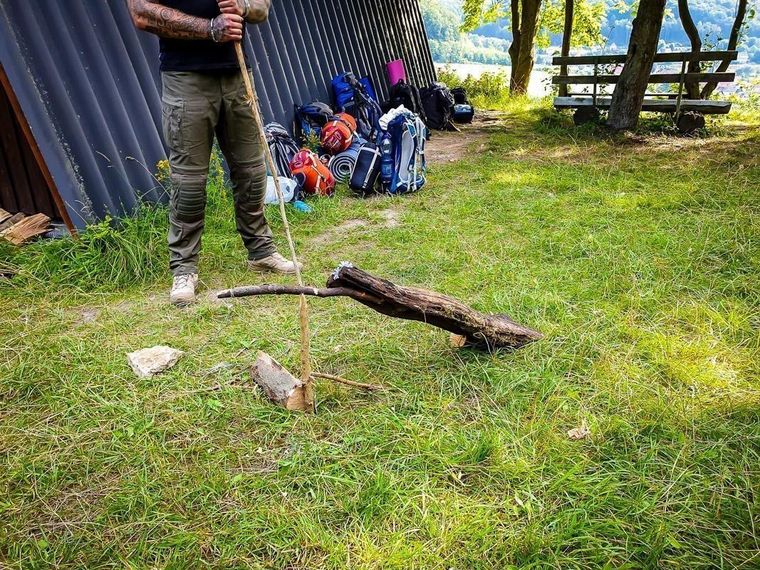 Ein Stock wird als Hebel für eine einfache Schlagfalle positioniert