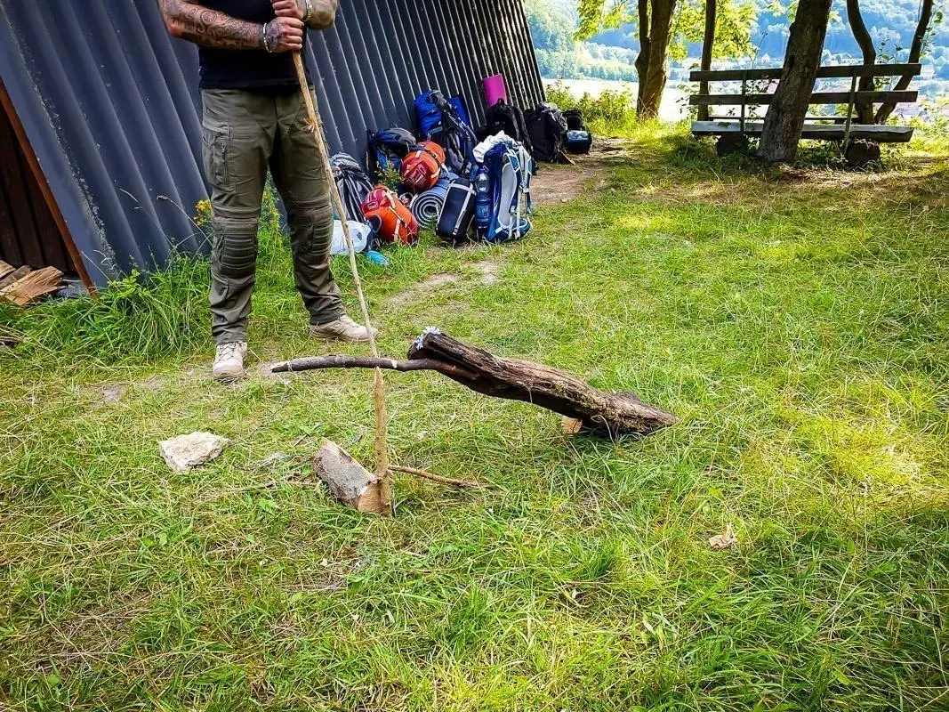 Ein Mann positioniert einen Stock für eine einfache Schlagfalle im Gras