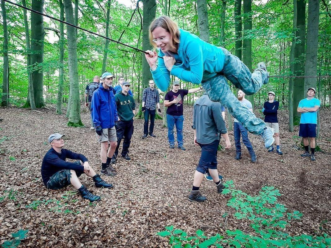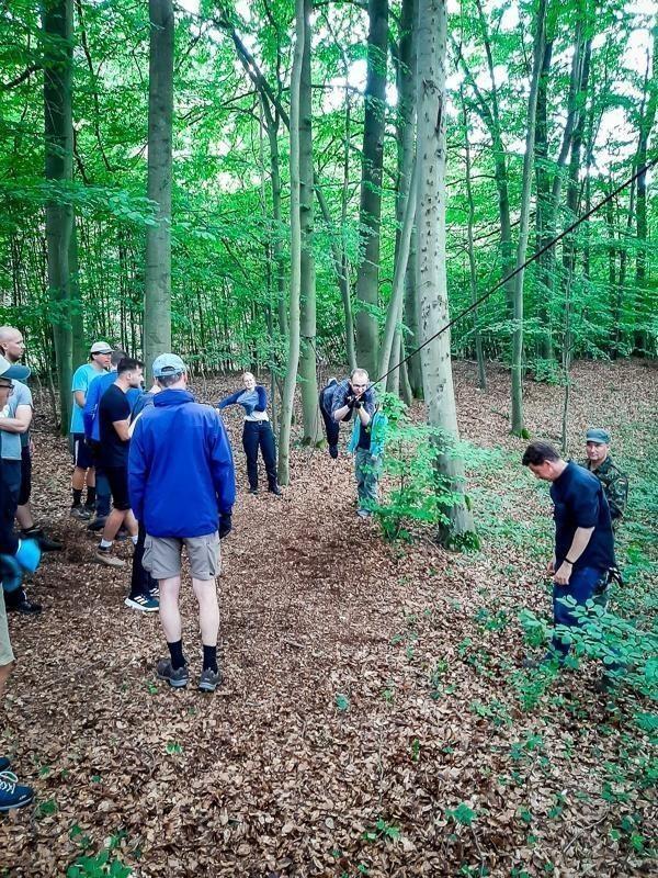 Teilnehmer üben den Einsatz einer selbstgebauten Seilbrücke im Wald