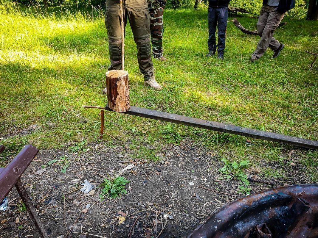 Holzstück steht aufrecht, mit improvisierter Axt aus einem Stock und einem weiteren Holzstück