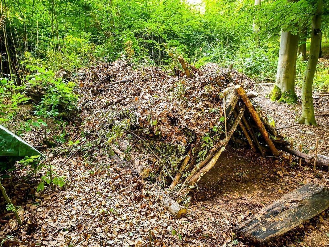 Laubhütte aus Ästen und Blättern in einem Waldgebiet