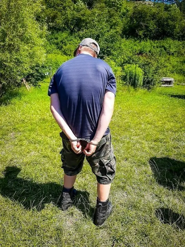 Mann mit Handschellen hinter dem Rücken steht auf einer Wiese