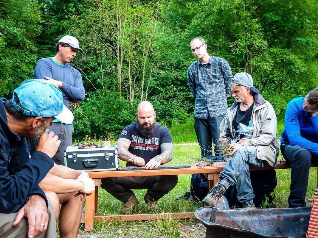 Mann zeigt Zunder und Techniken zur Feuerentfachung an einem Tisch