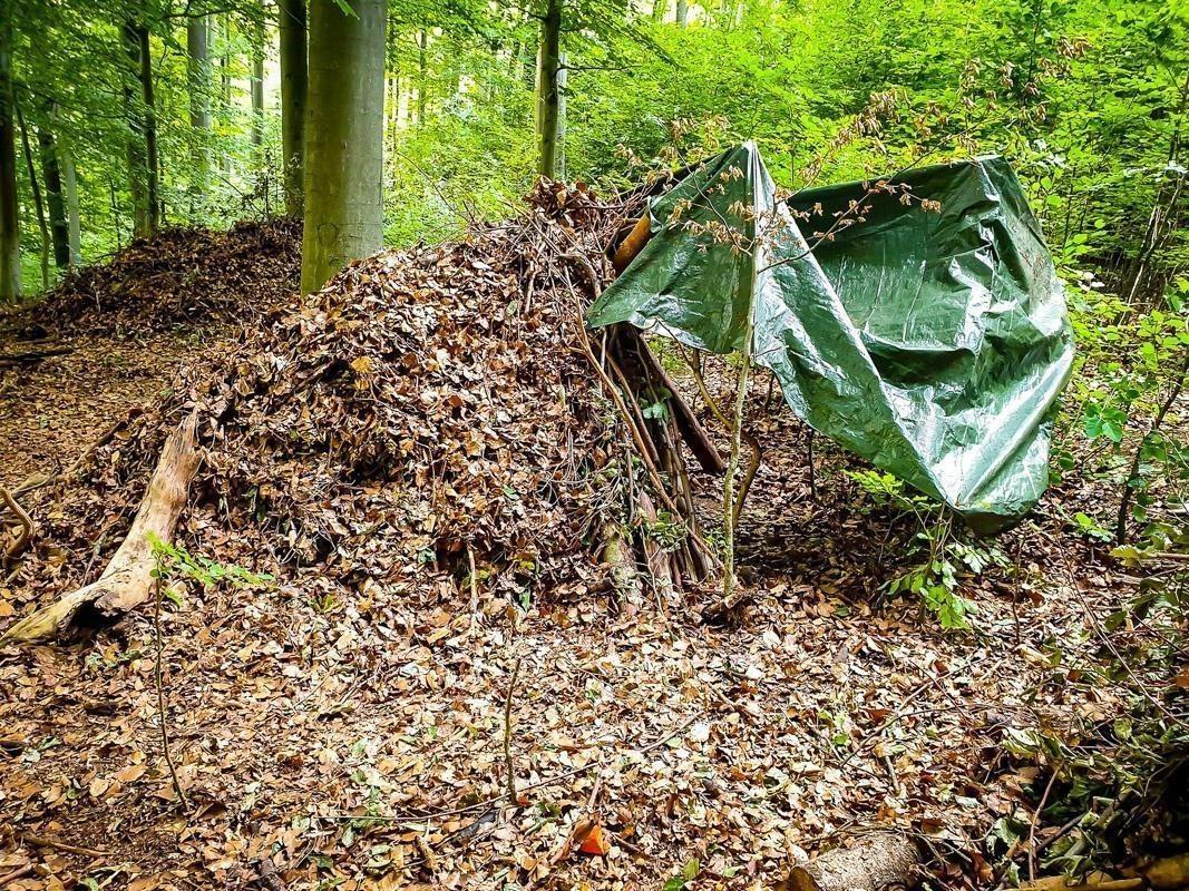 Tarp-Notunterkunft aus Ästen und Laub in einem Waldgebiet