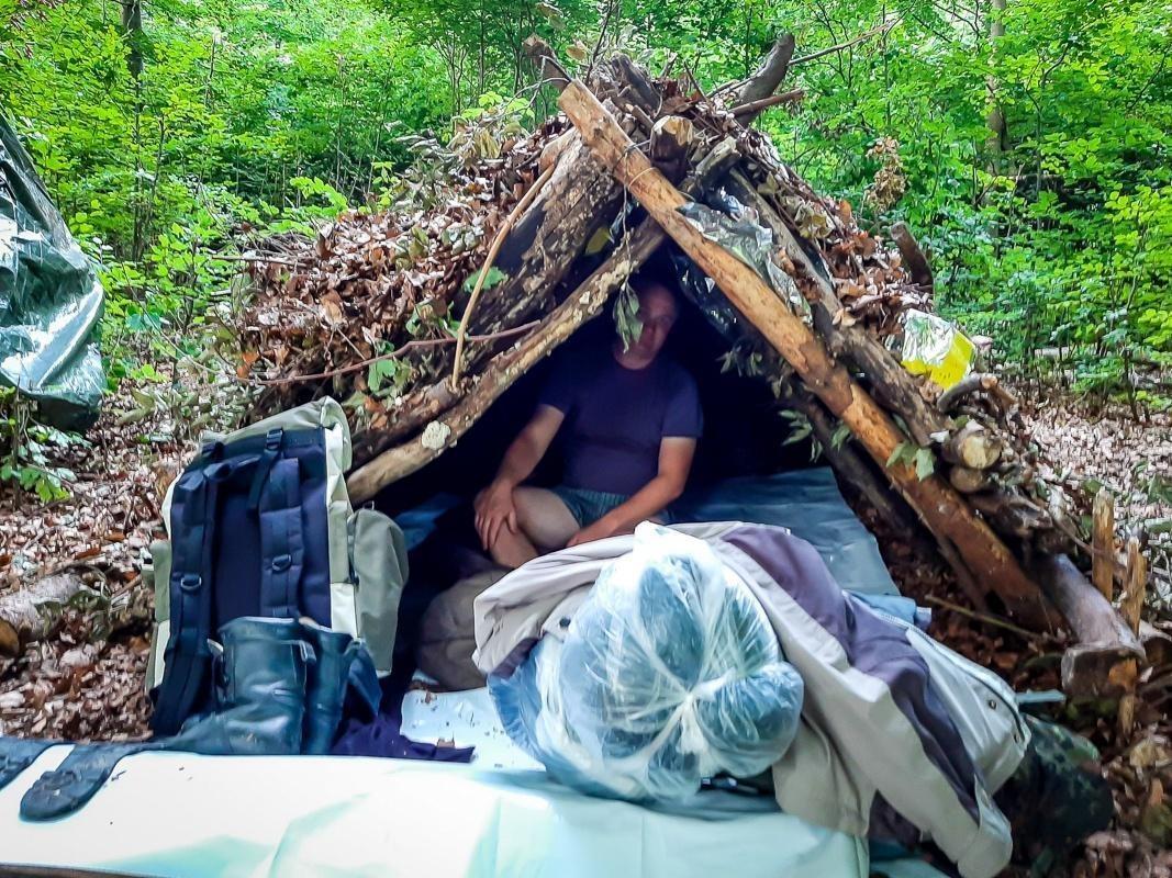 Tarp-Notunterkunft aus Ästen und Laub mit Rucksack und Ausrüstung im Vordergrund
