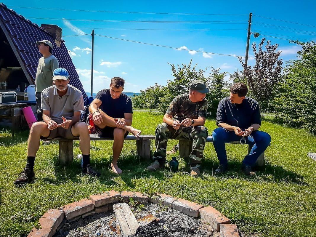 Vier Personen sitzen auf Holzbank vor einem Lagerfeuer, umgeben von Grün