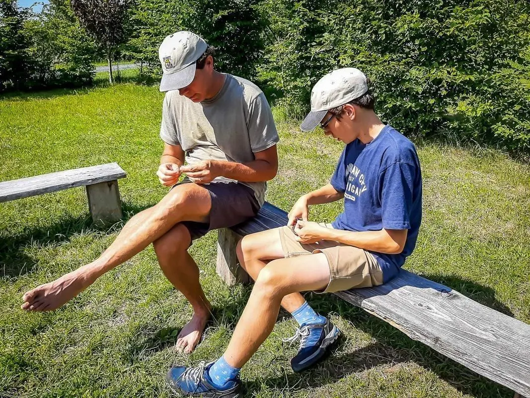 Ein Teilnehmer bindet eine improvisierte Schiene an das Bein eines anderen