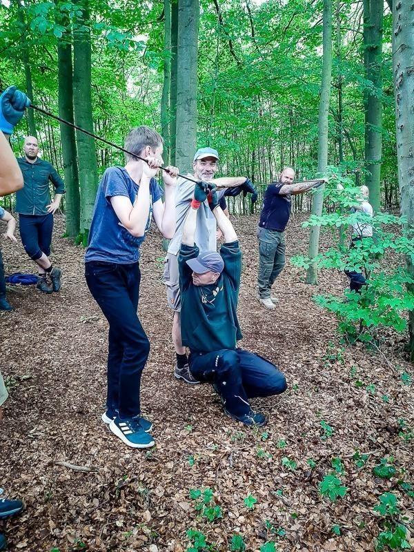 Gruppe übt den Aufbau einer selbstgebauten Seilbrücke zwischen Bäumen im Wald