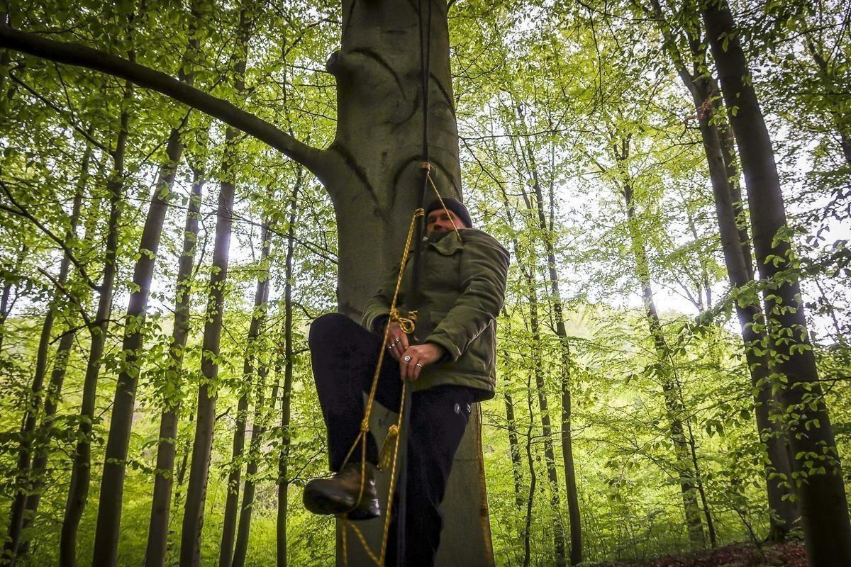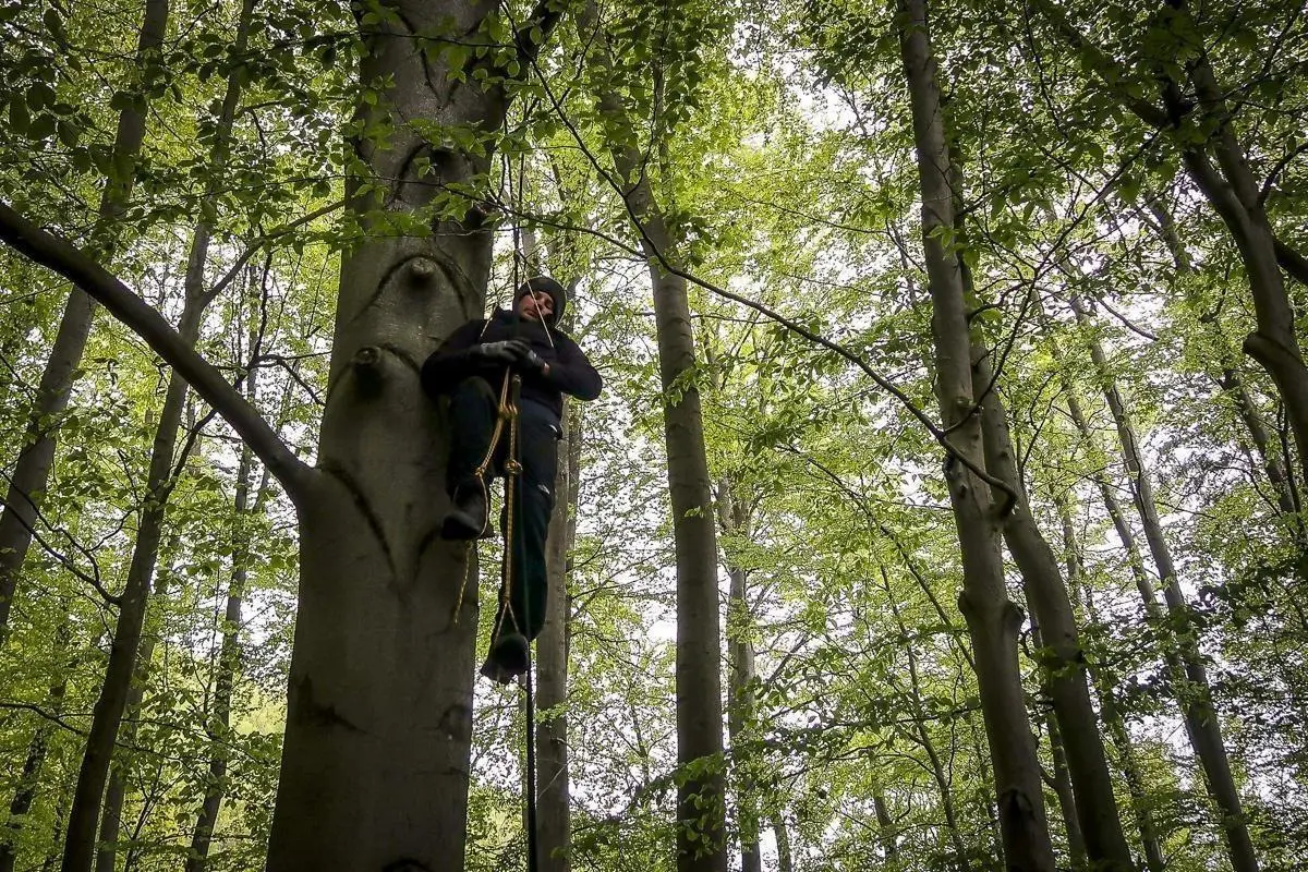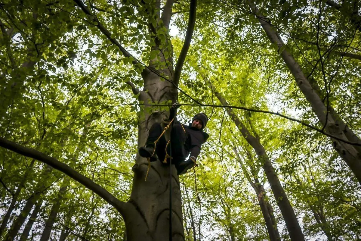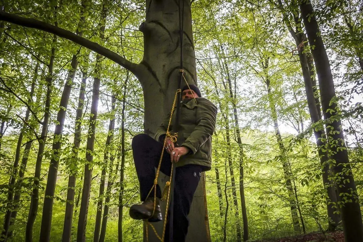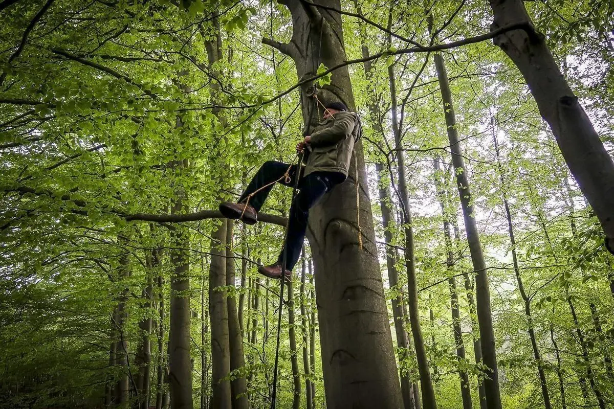 Kletterseil ist an einem Baum befestigt, während jemand in den Baum steigt