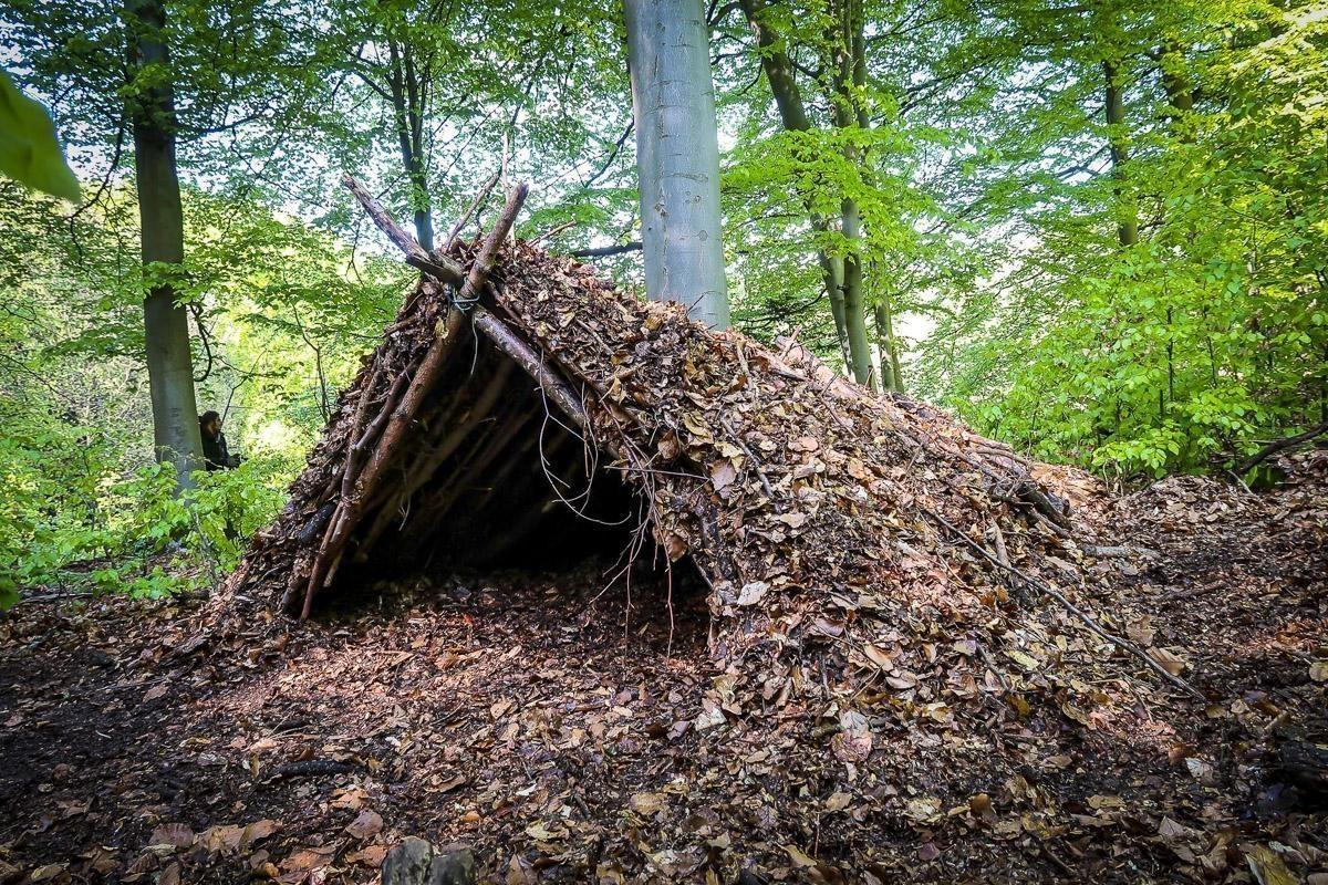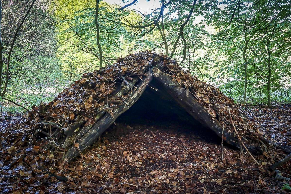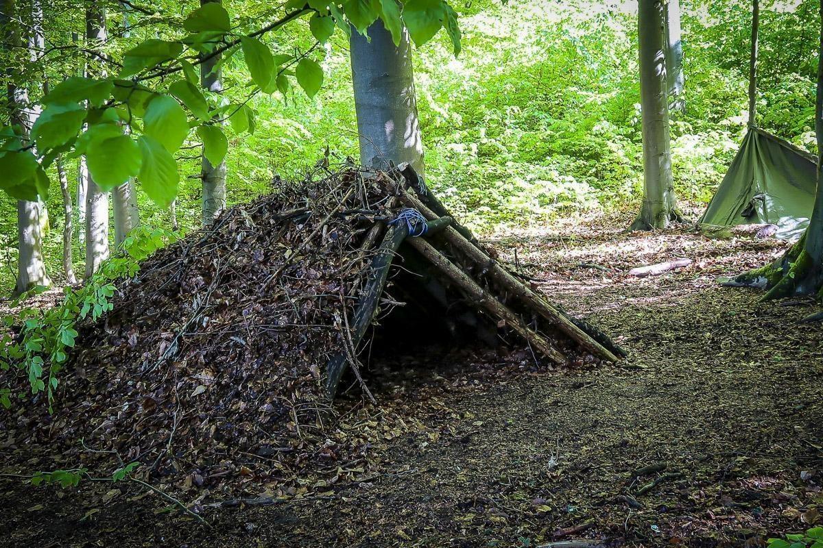 Tarp-Notunterkunft aus Ästen und Laub im Wald