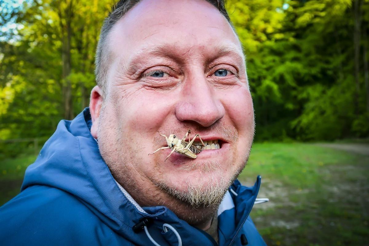 Mann mit Heuschrecke auf der Lippe lächelt in die Kamera