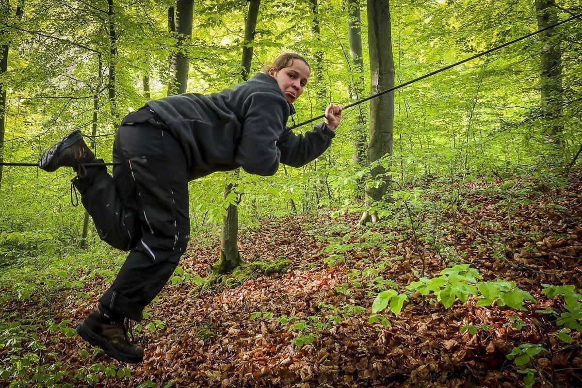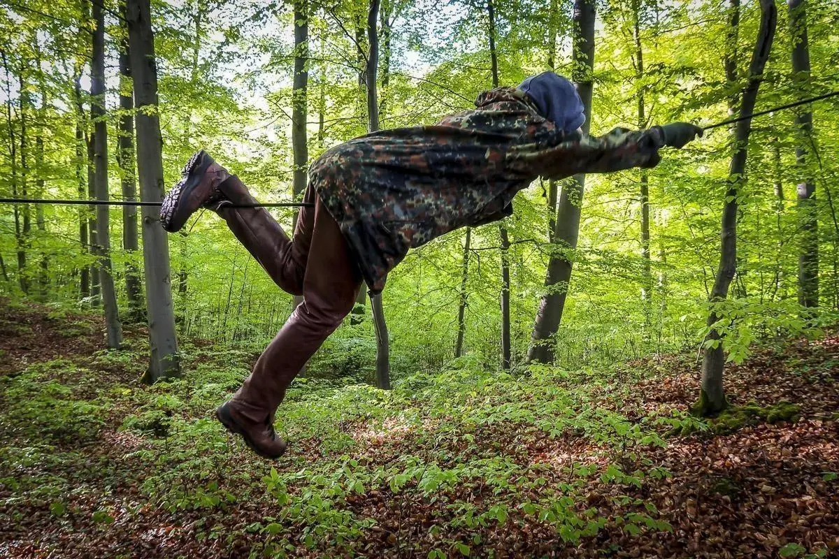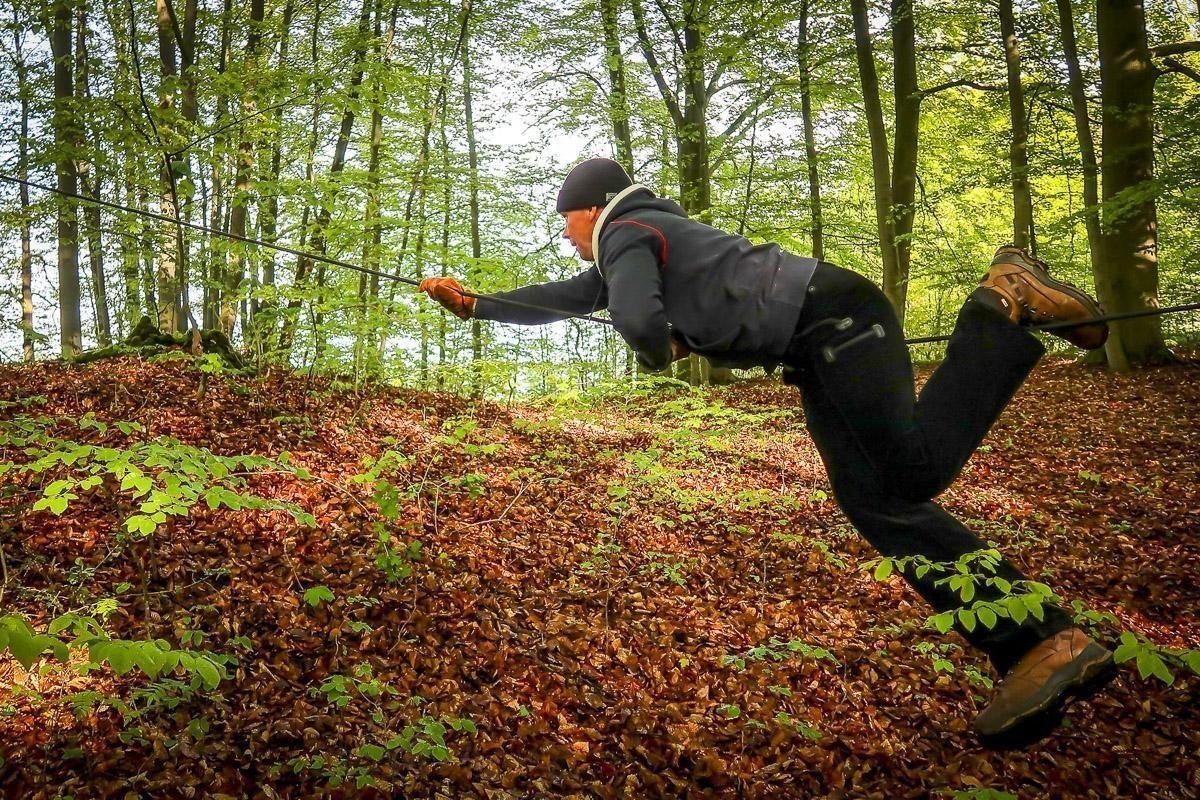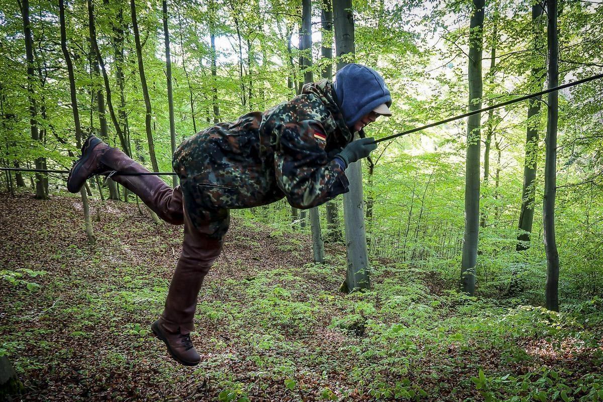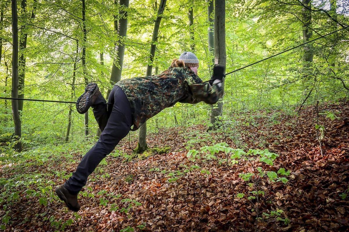 Person nutzt Seil zur Fortbewegung über einen Hang im Wald