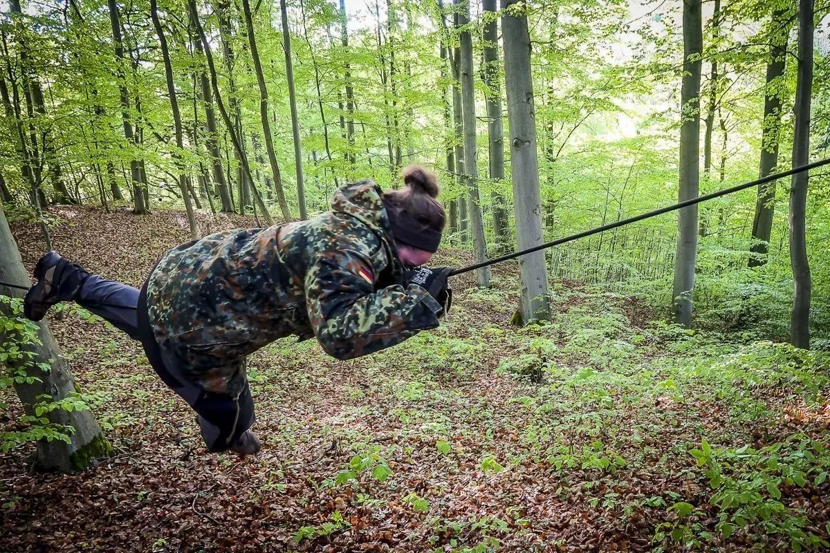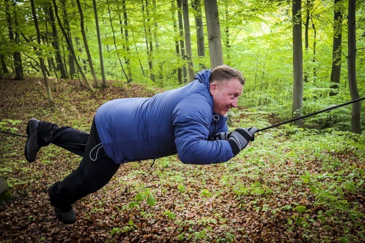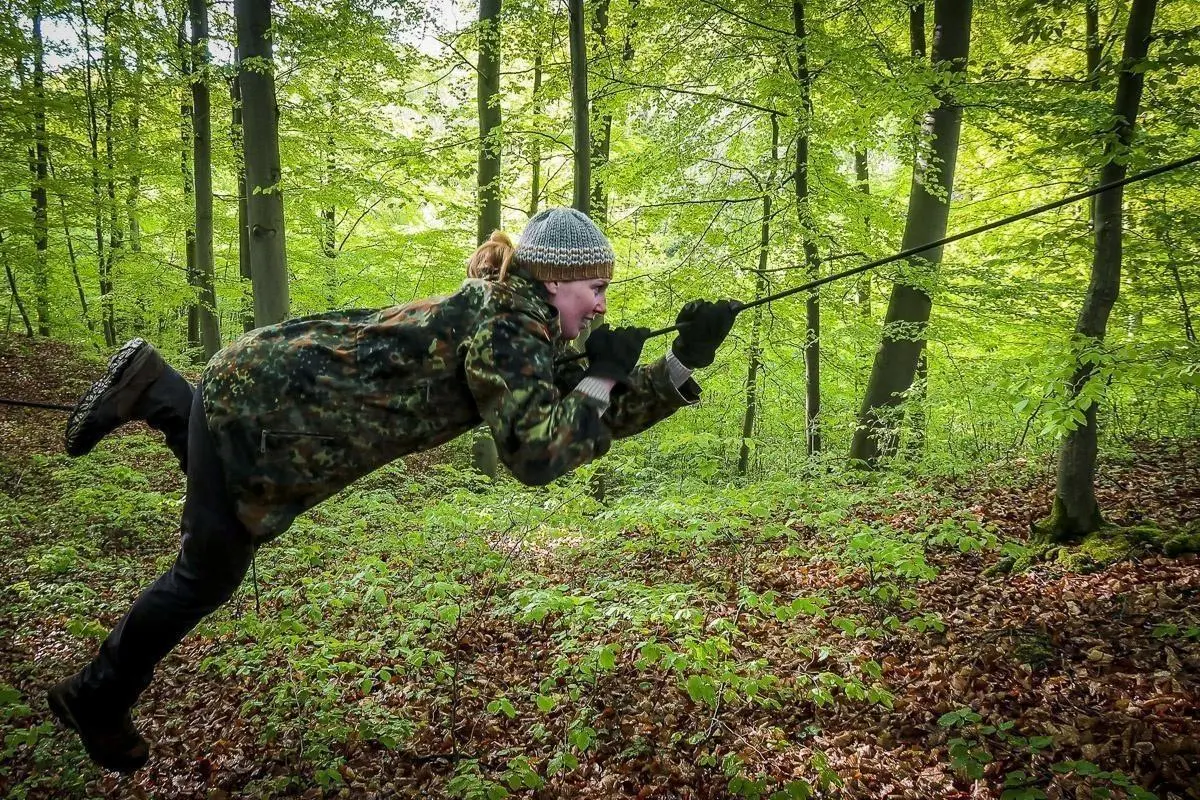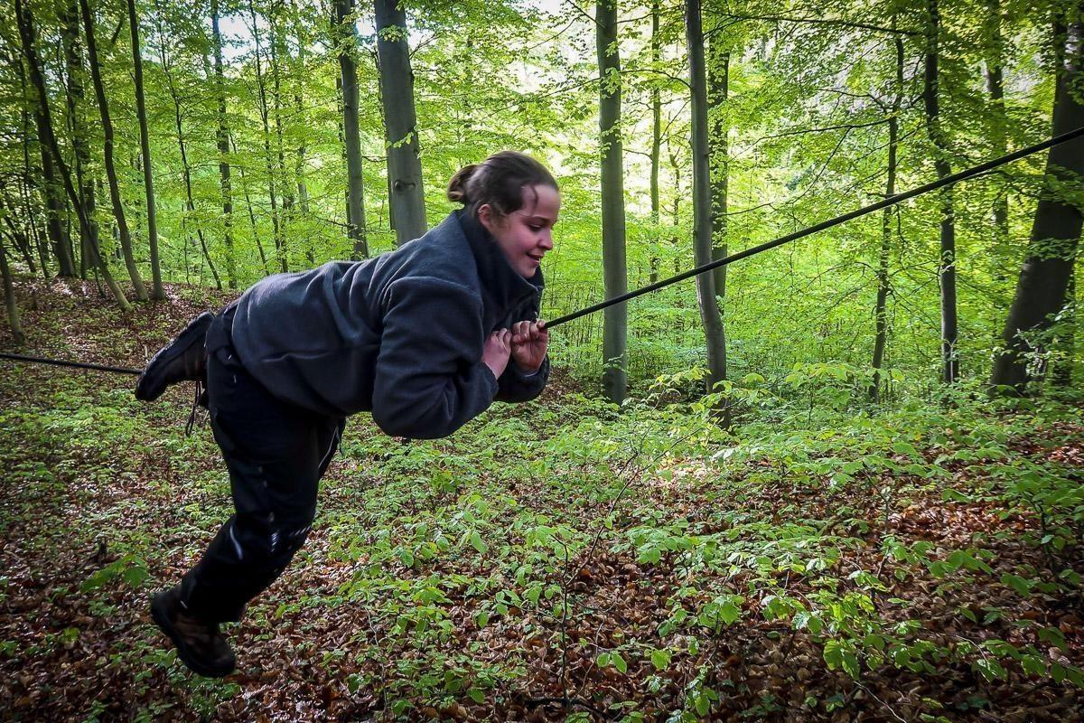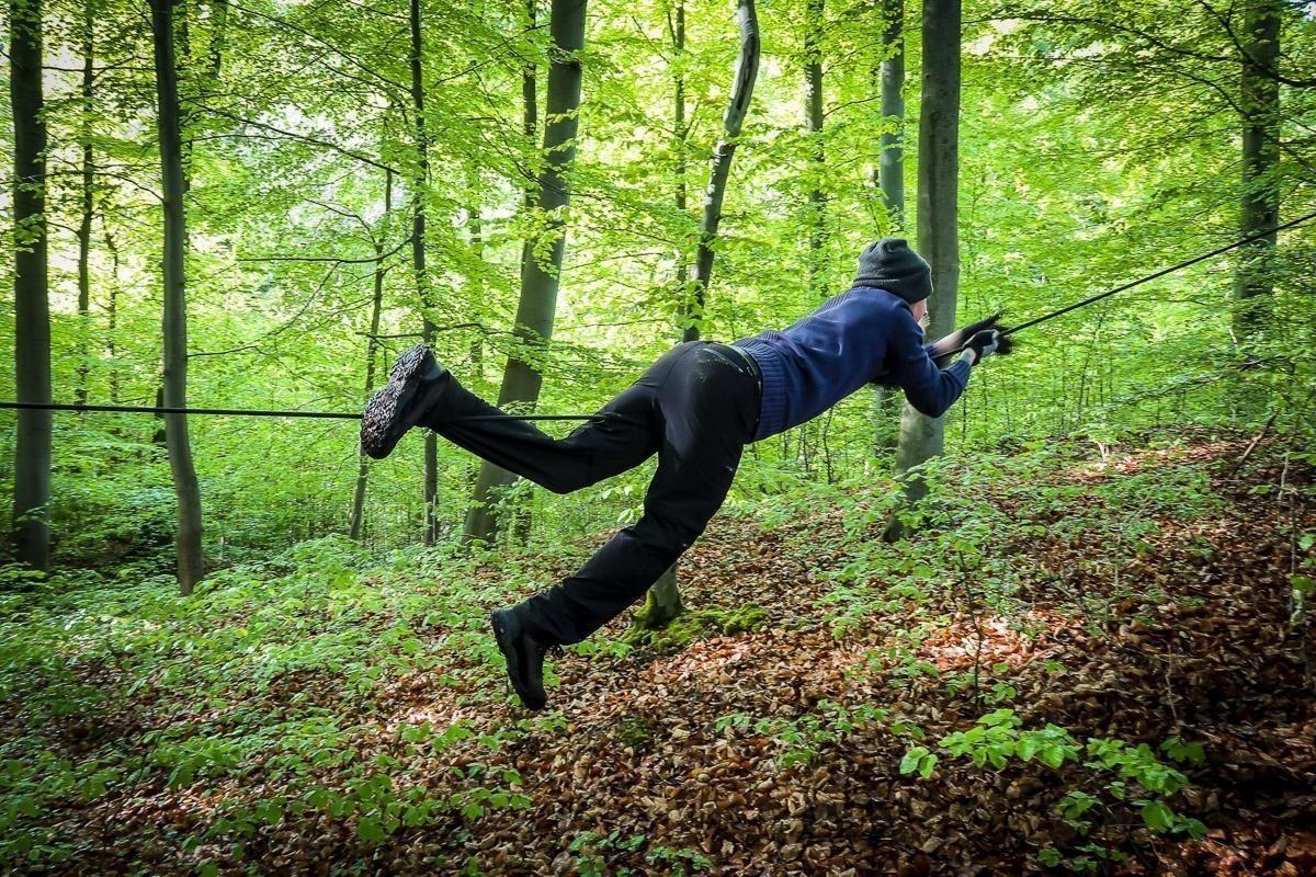 Person nutzt Seil zur Fortbewegung über einen Hang im Wald