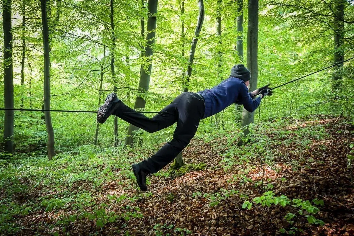 Person nutzt Seilbrücke zur Fortbewegung über den Waldboden