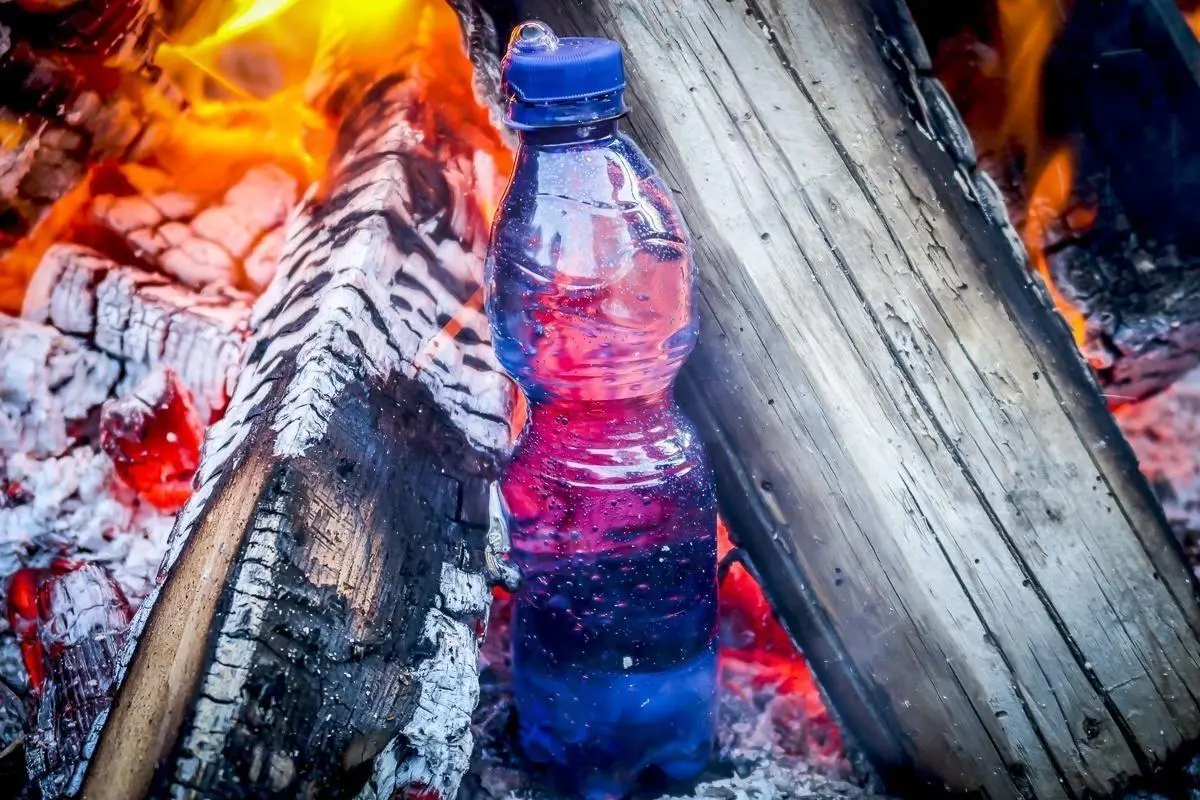 Wasserflasche steht zwischen brennenden Holzscheiten im Feuer