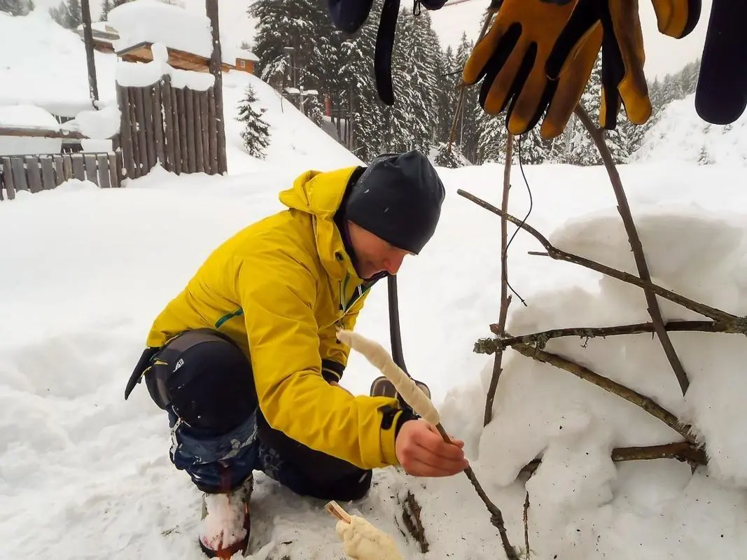 Während des Trainings wurden auch verschiedene praktische Übungen durchgeführt, bei denen die Teilnehmer ihre Fähigkeiten in der Zunderaufbereitung und Glutpflege vertiefen konnten. Das Entzünden von Zunder auf einer Schaufel stellte eine praktische Anwendung dar, die in einer realen Überlebenssituation von Nutzen sein könnte. Die Möglichkeit, im Schnee zu arbeiten und verschiedene Techniken auszuprobieren, förderte das Verständnis für die Herausforderungen des Überlebens in der Natur.