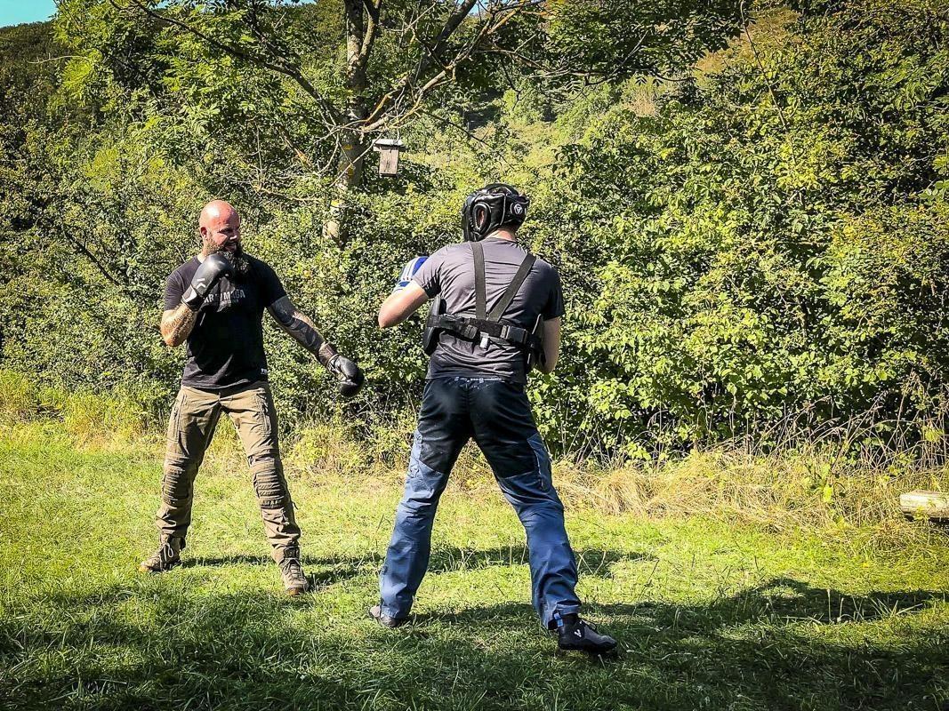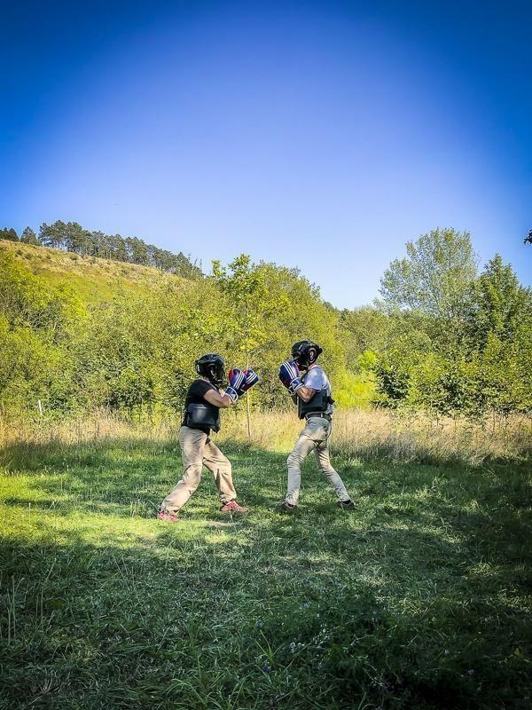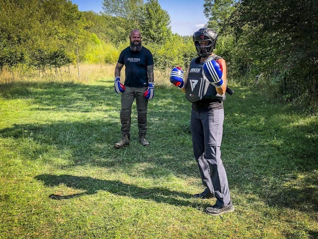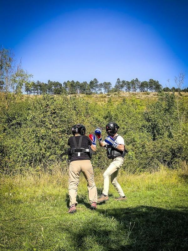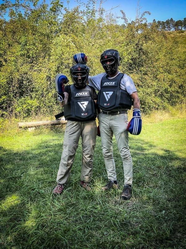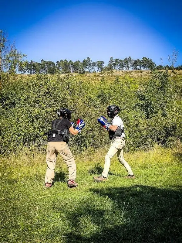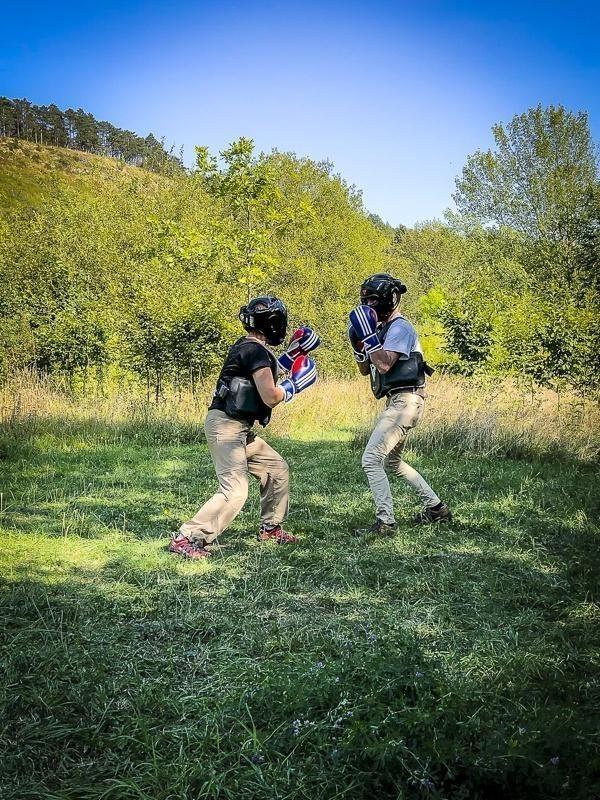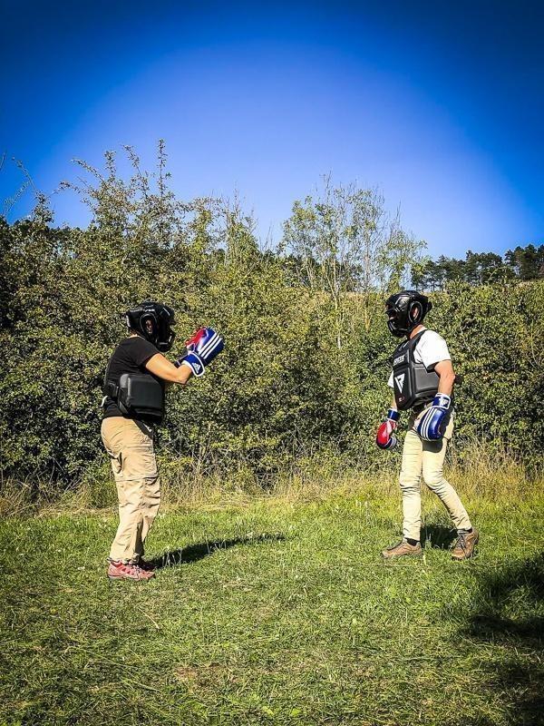 Zwei Personen in Schutzausrüstung üben Boxtechniken auf einer Wiese