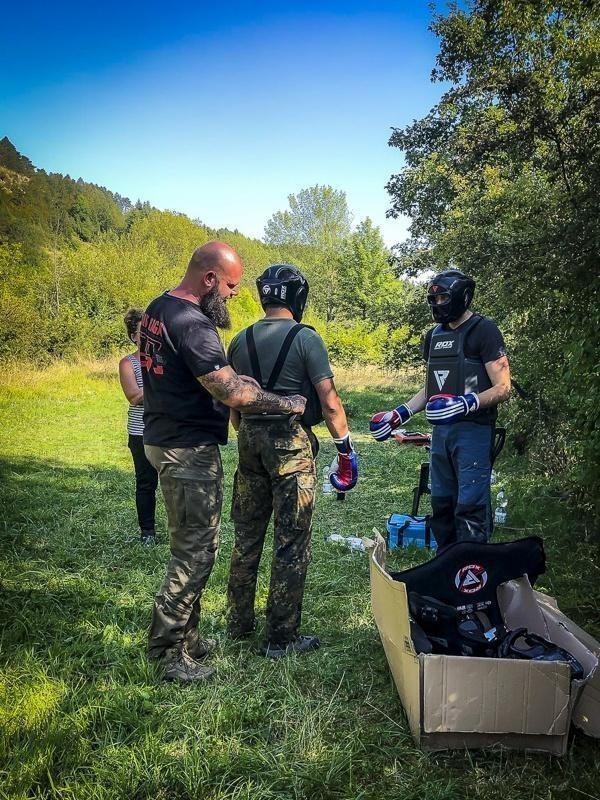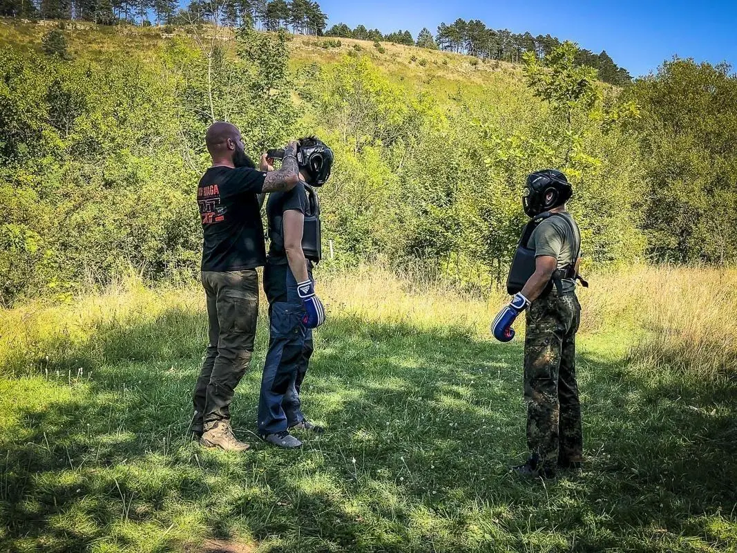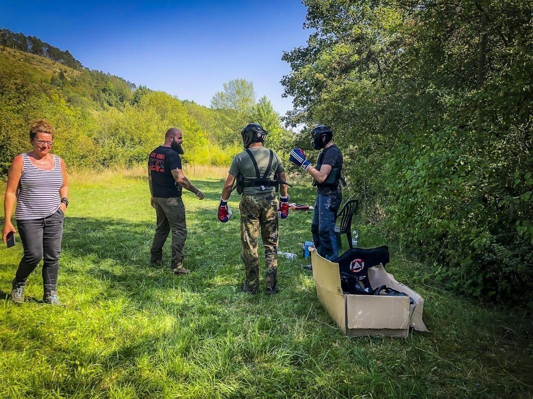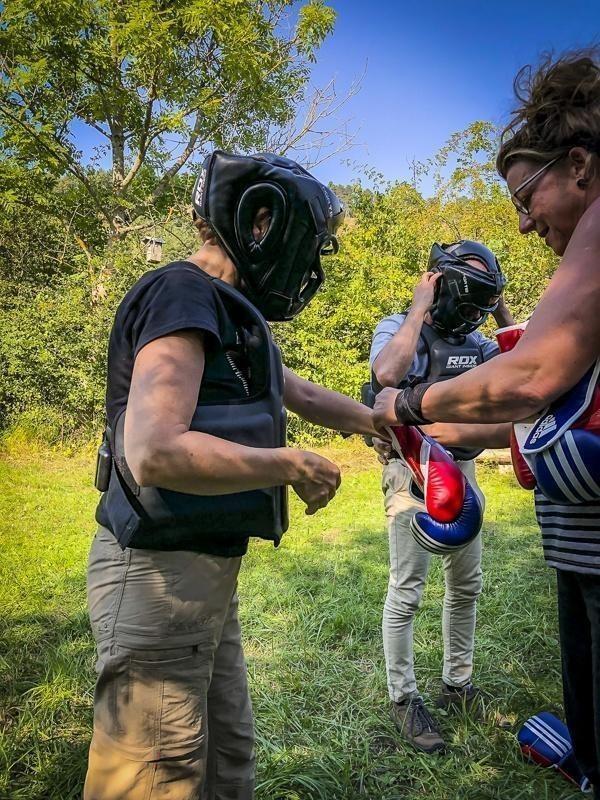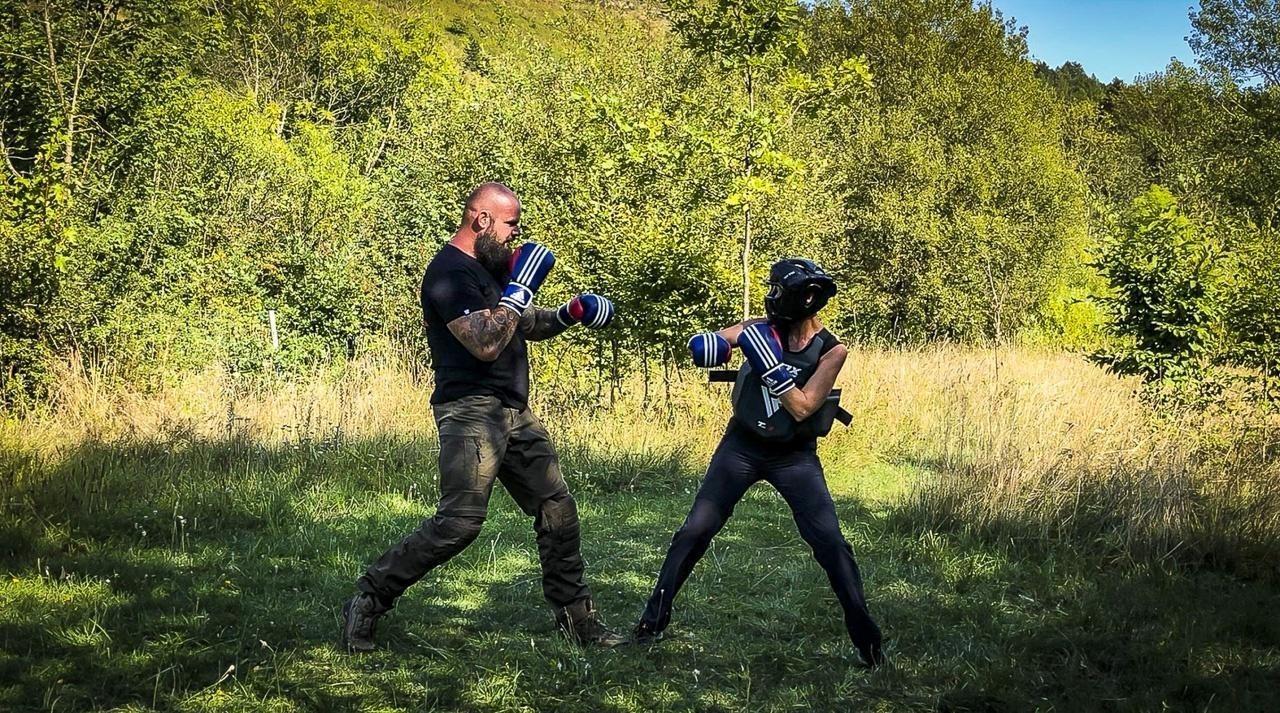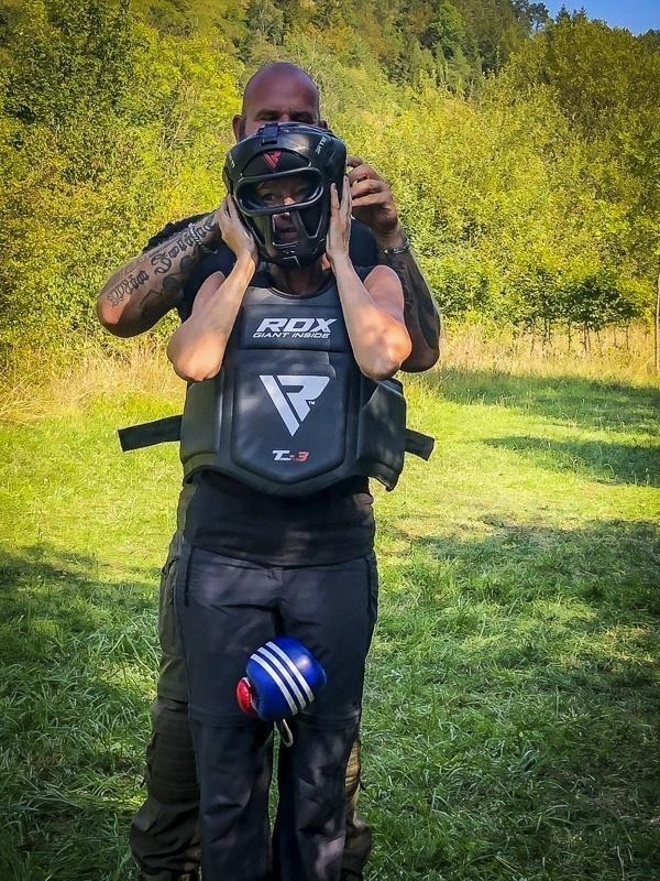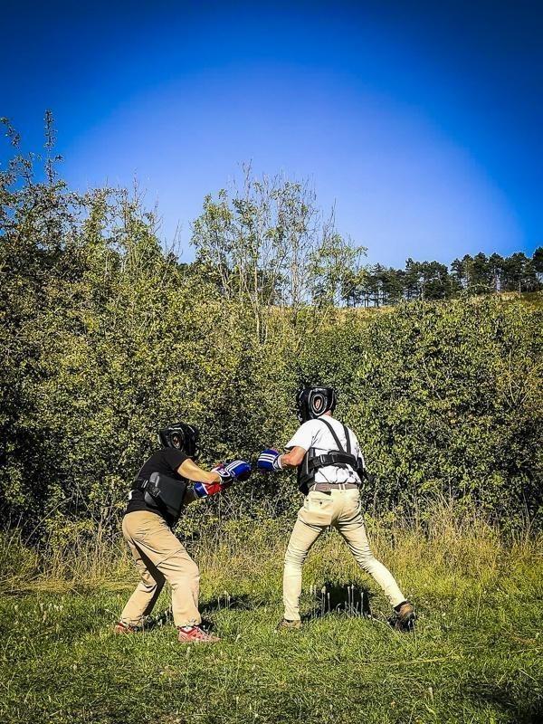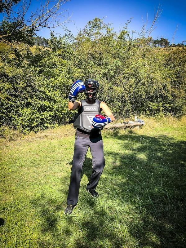 Zwei Personen in Schutzausrüstung üben Boxtechniken auf einer Wiese