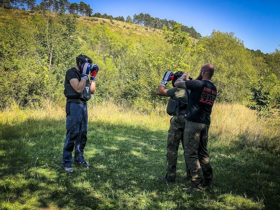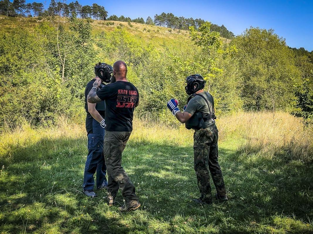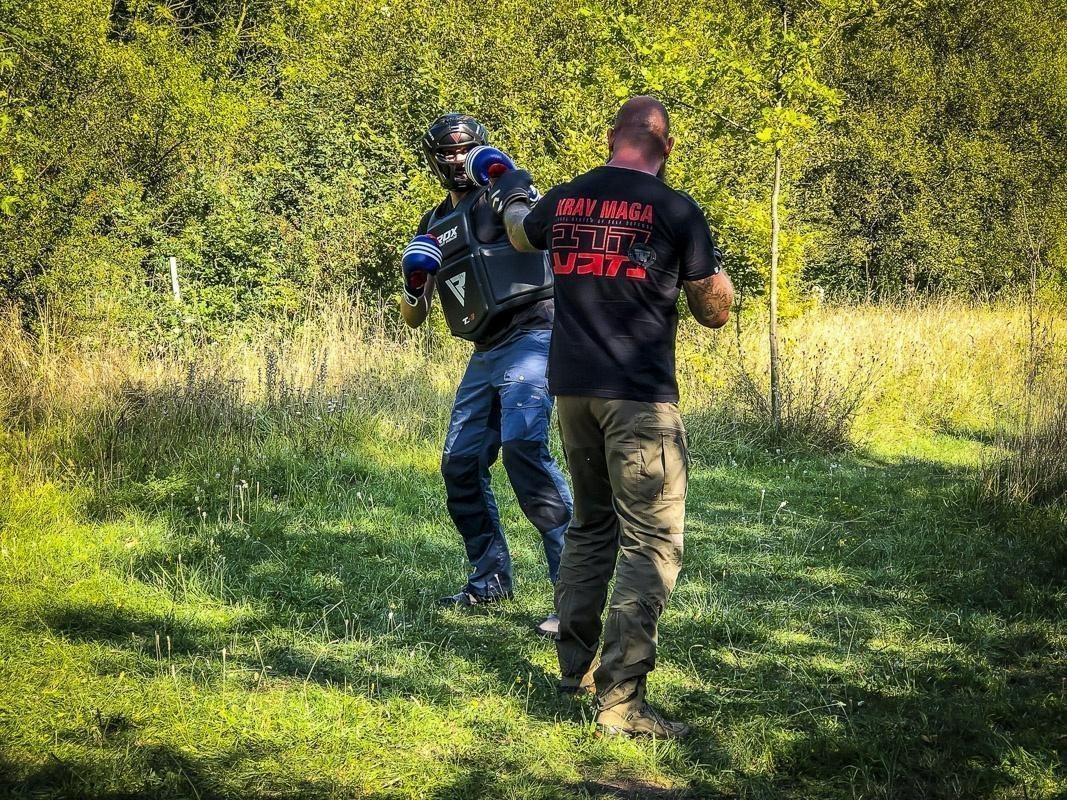 Zwei Personen üben Selbstverteidigungstechniken im Freien, einer trägt Schutzausrüstung