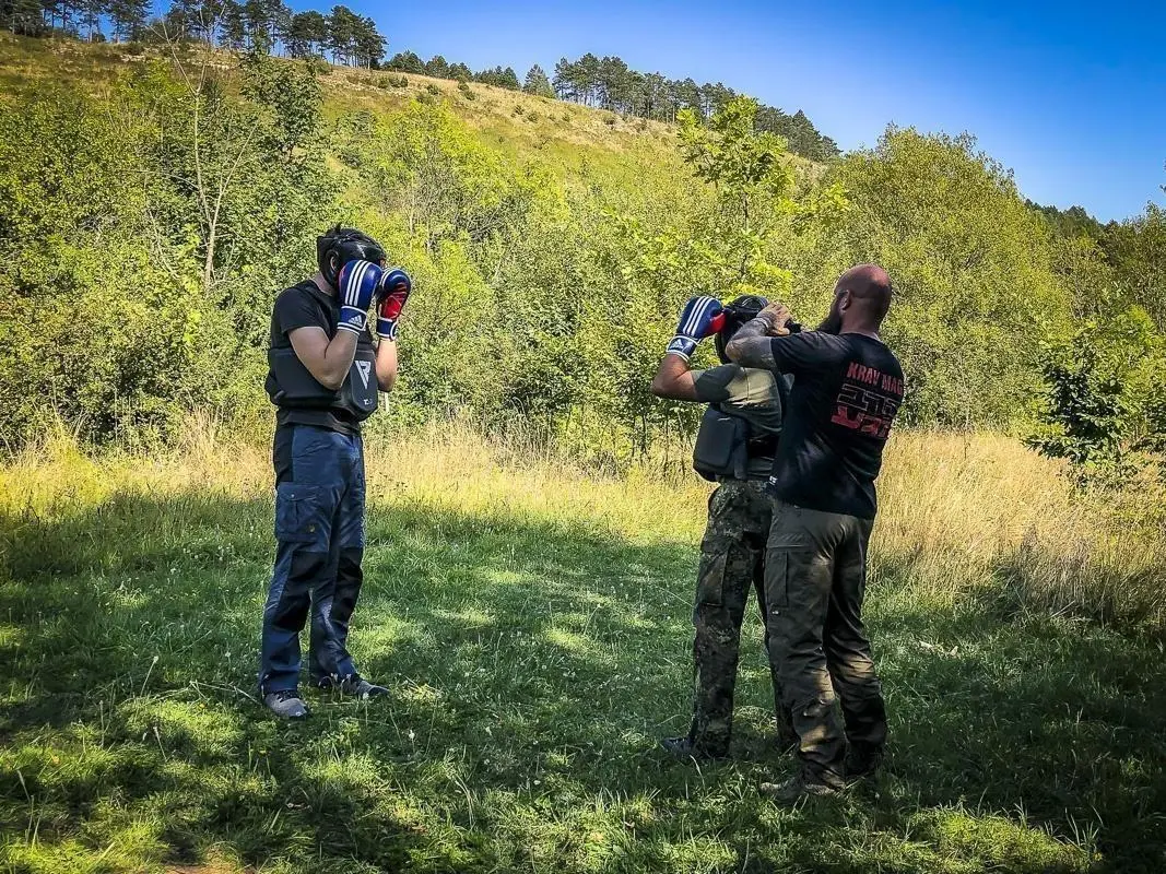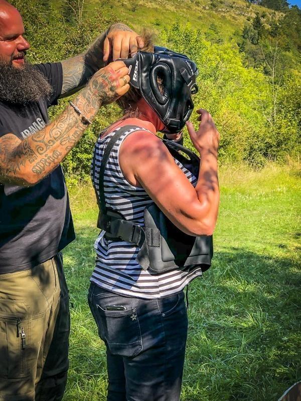 Zwei Personen üben im Freien Kampftechniken mit Schutzausrüstung und Handschuhen