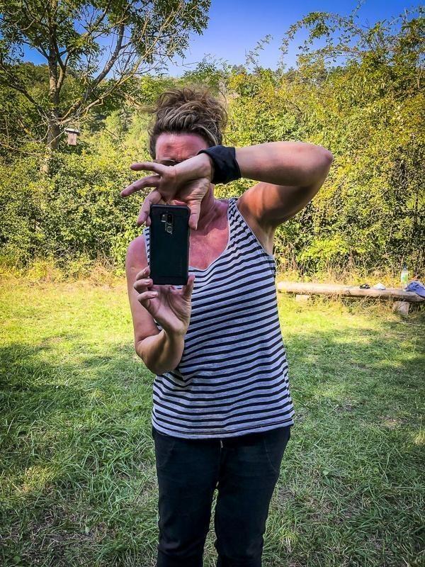 Lächelnde Person mit gestreiftem Oberteil steht auf einer Wiese