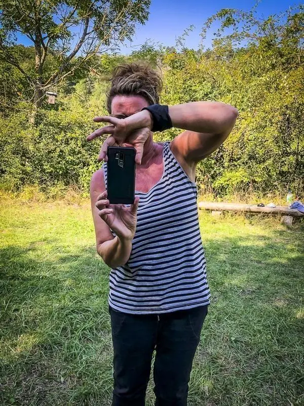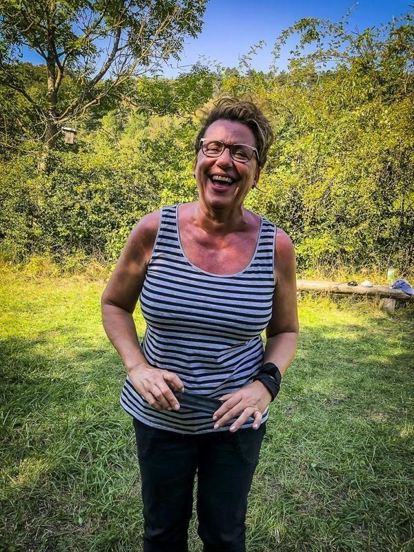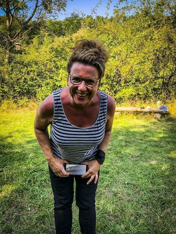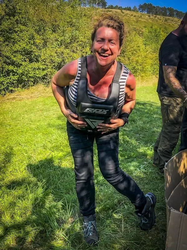 Person trägt eine Gewichtswesten und lächelt auf einer Wiese