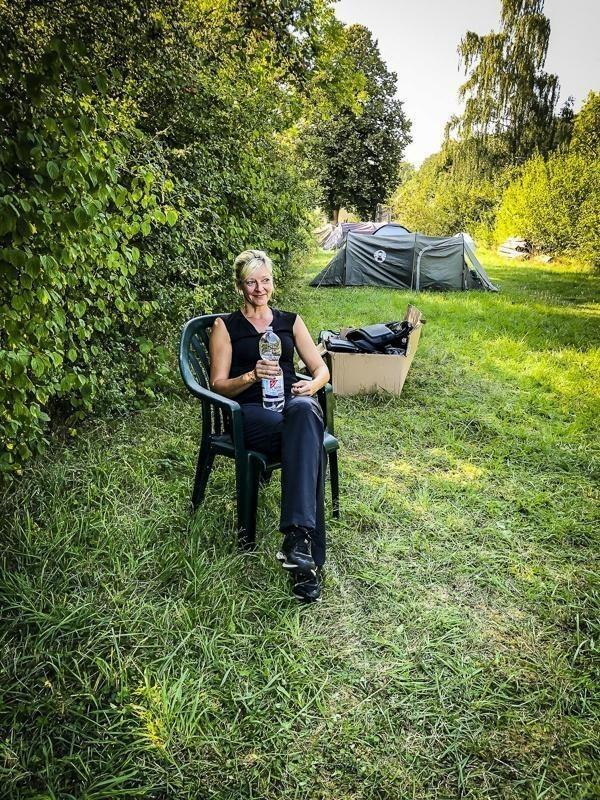 Frau sitzt auf einem Stuhl und hält eine Wasserflasche in der Hand