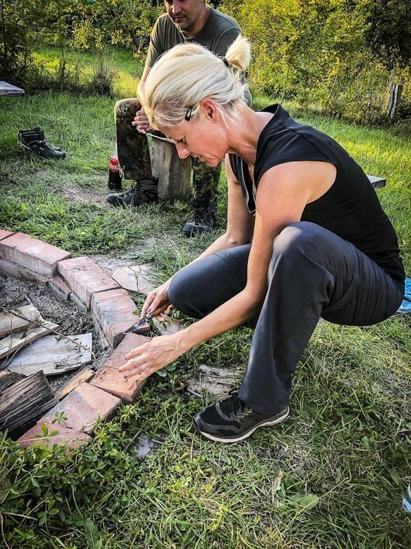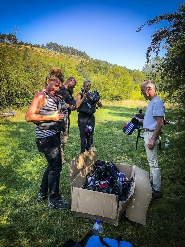 Trainer hilft Teilnehmerin beim Anlegen einer Schutzausrüstung auf einer Wiese