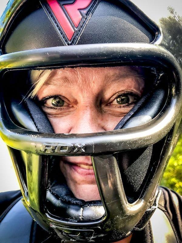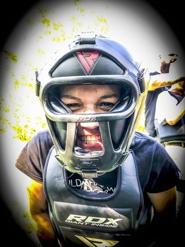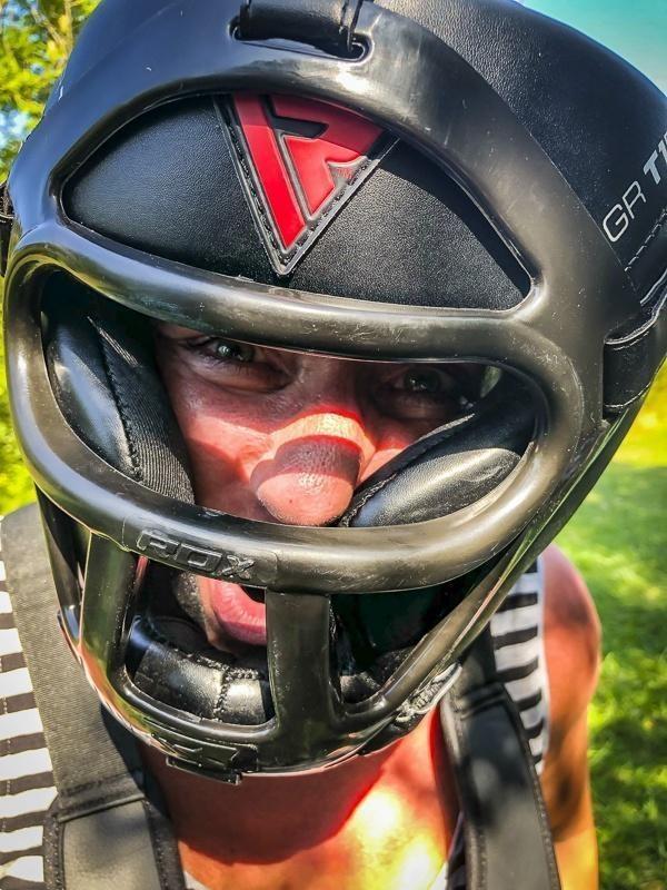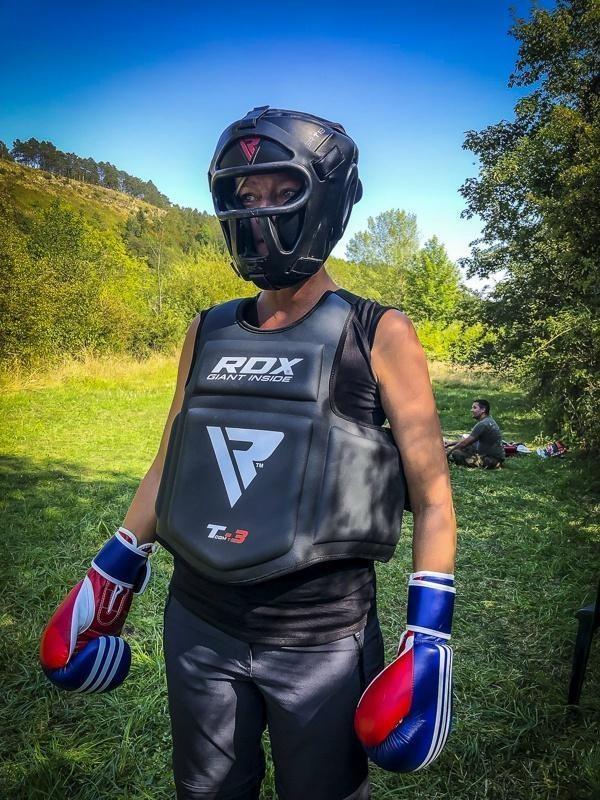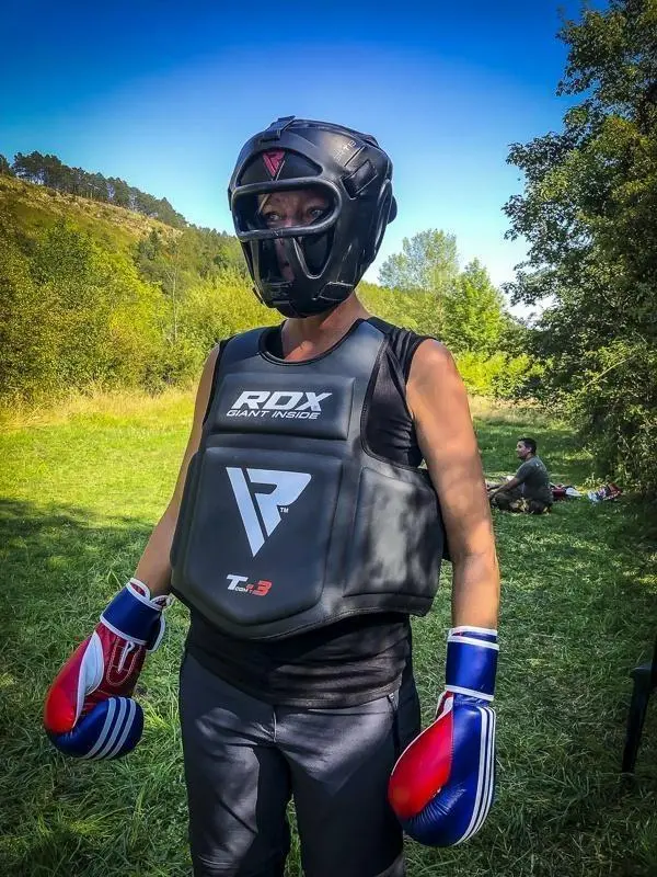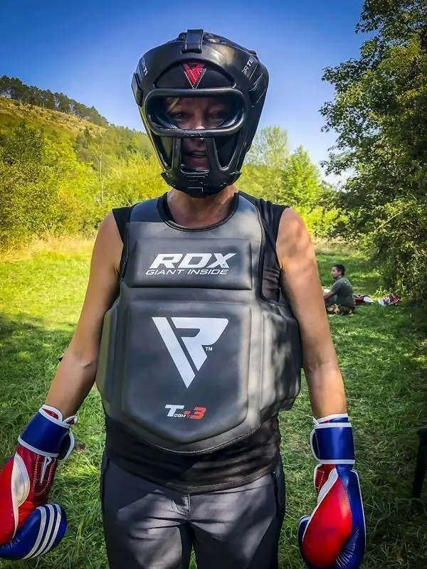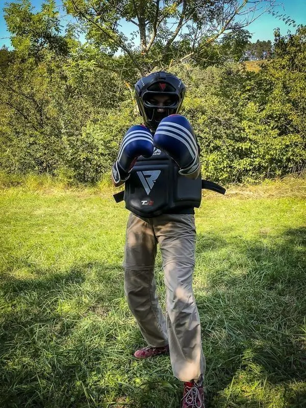 Person trägt Schutzausrüstung und Boxhandschuhe, bereit für einen Kampf