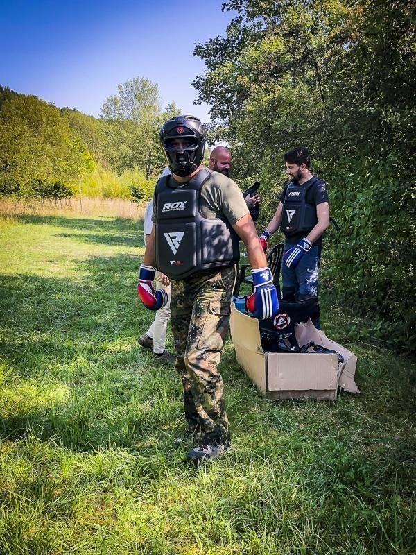 Drei Personen in Schutzausrüstung stehen auf einer Wiese, einer trägt Boxhandschuhe