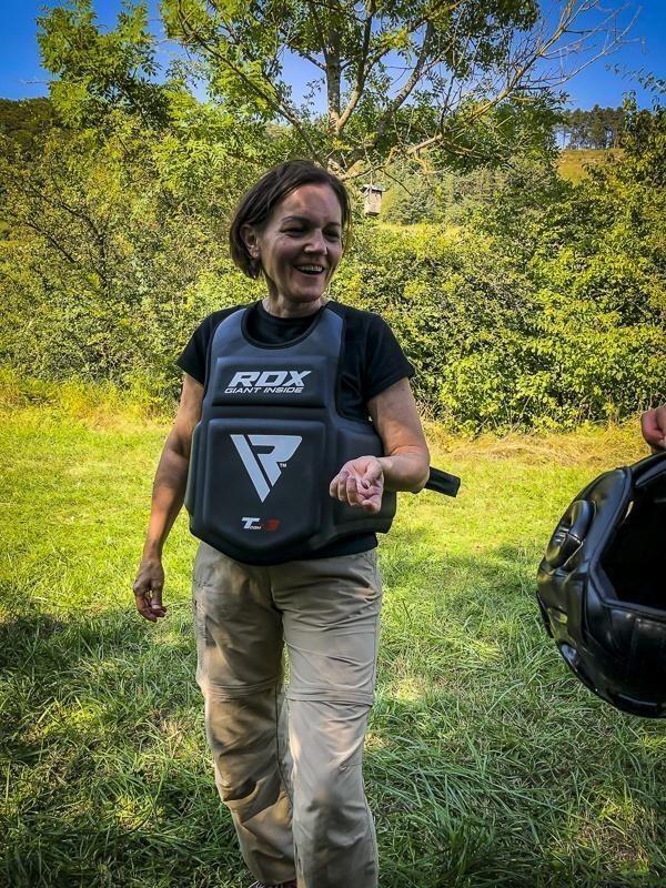 Person trägt Schutzausrüstung mit Helm und Boxhandschuhen in der Natur