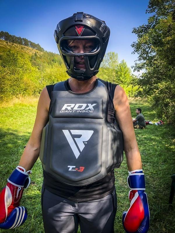 Person trägt Schutzausrüstung und Boxhandschuhe, bereit für das Training