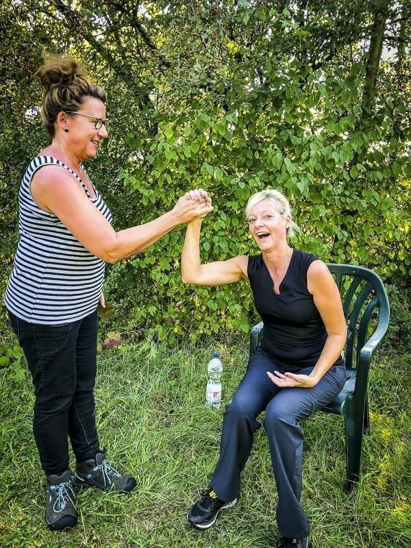 Zwei Frauen führen ein Armdrücken im Freien durch, eine sitzt auf einem Stuhl