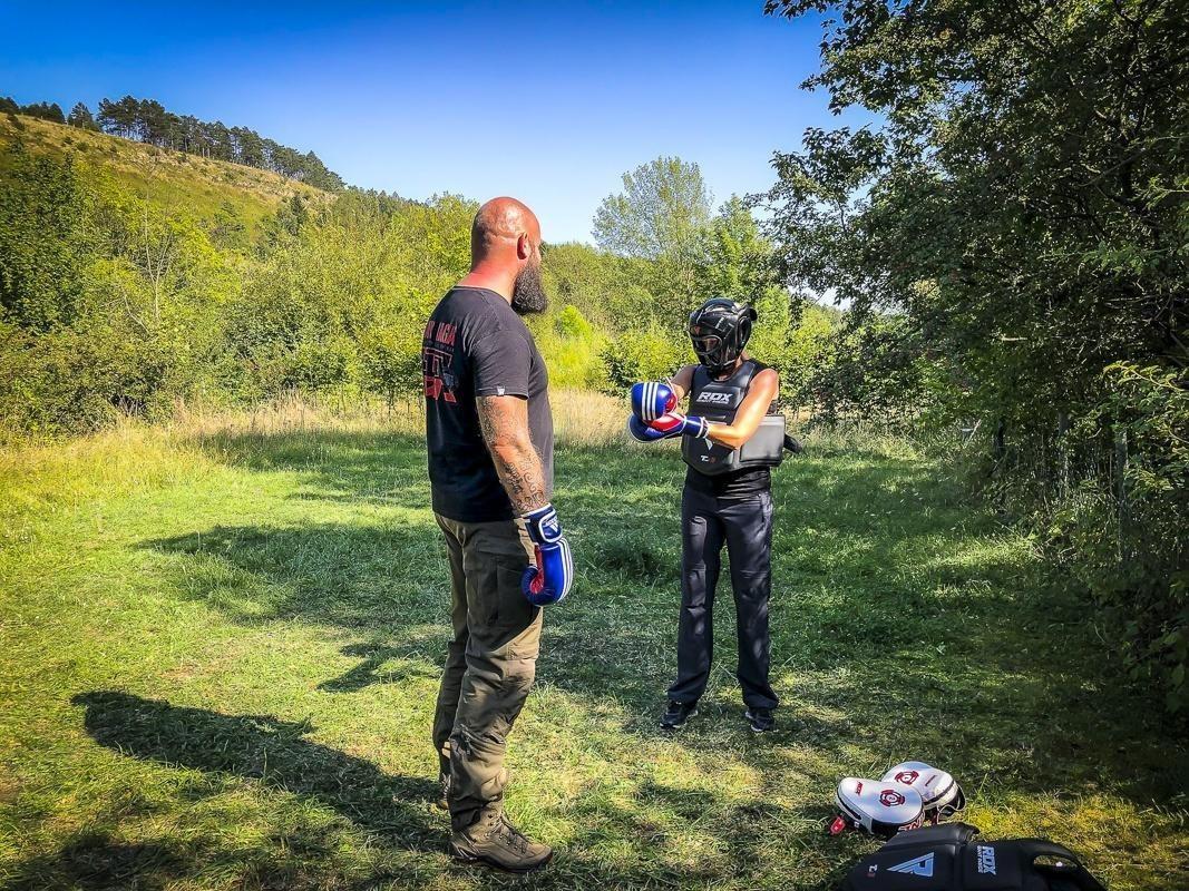 Zwei Personen trainieren im Freien mit Boxhandschuhen und Schutzausrüstung