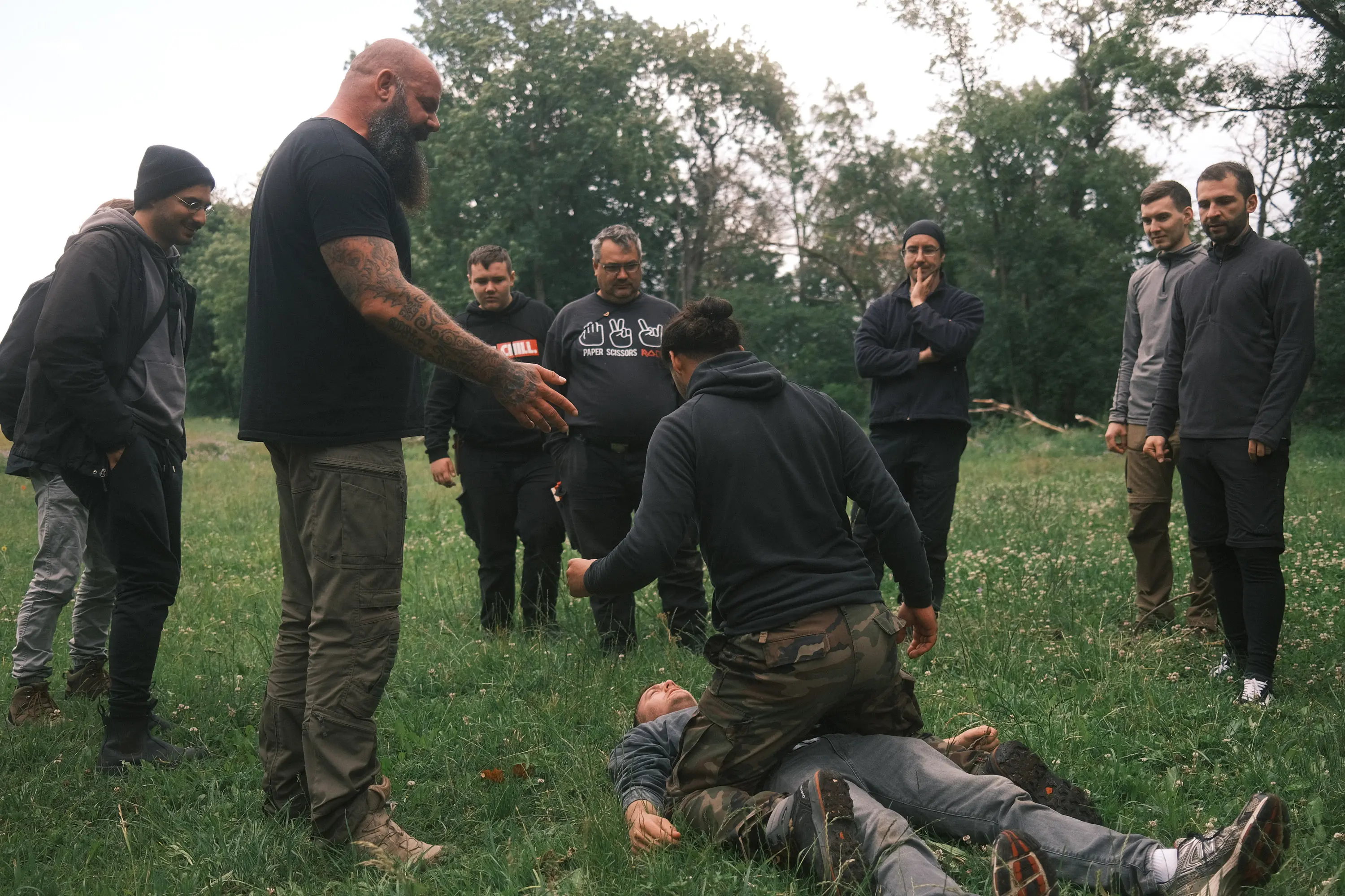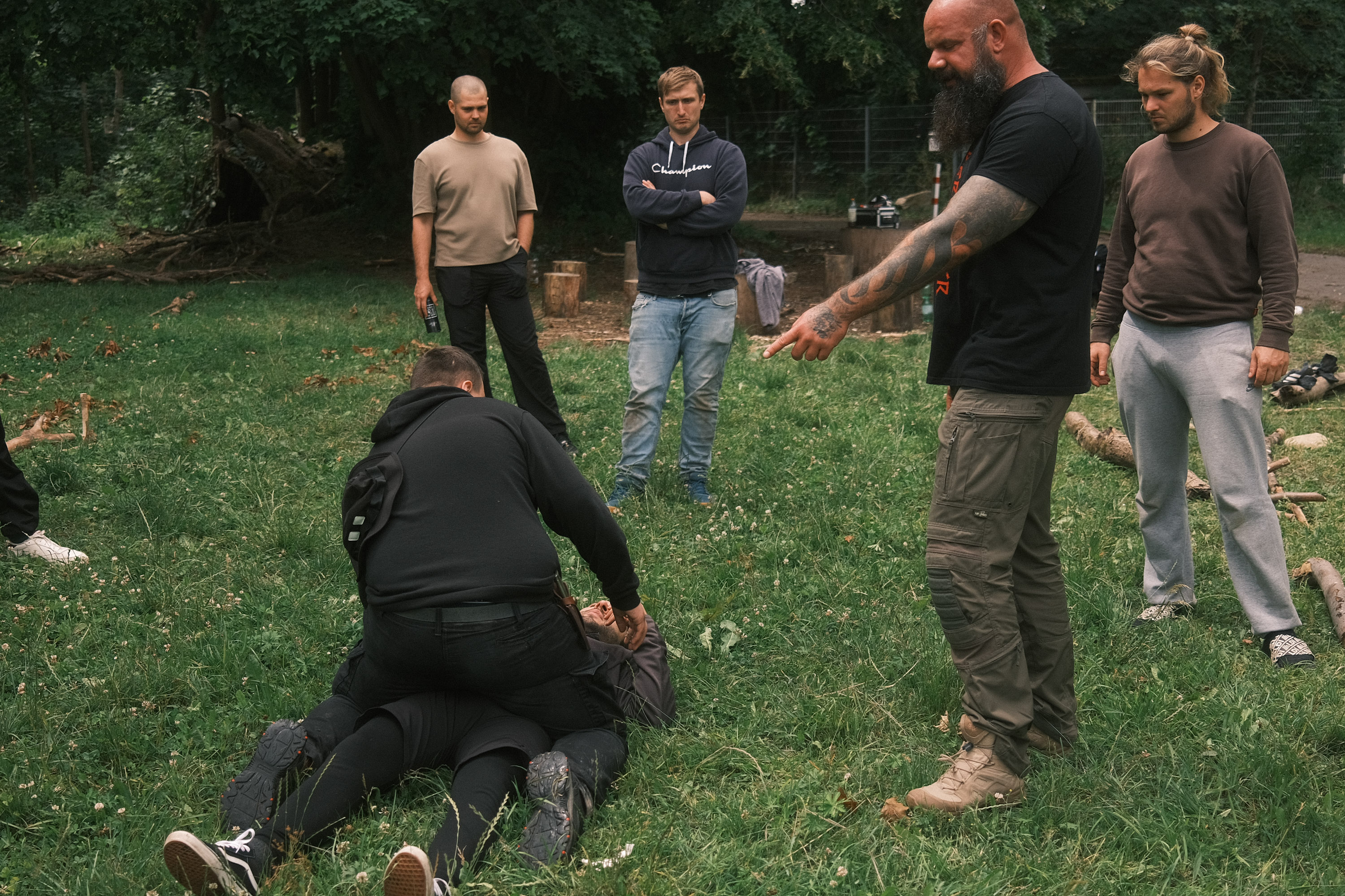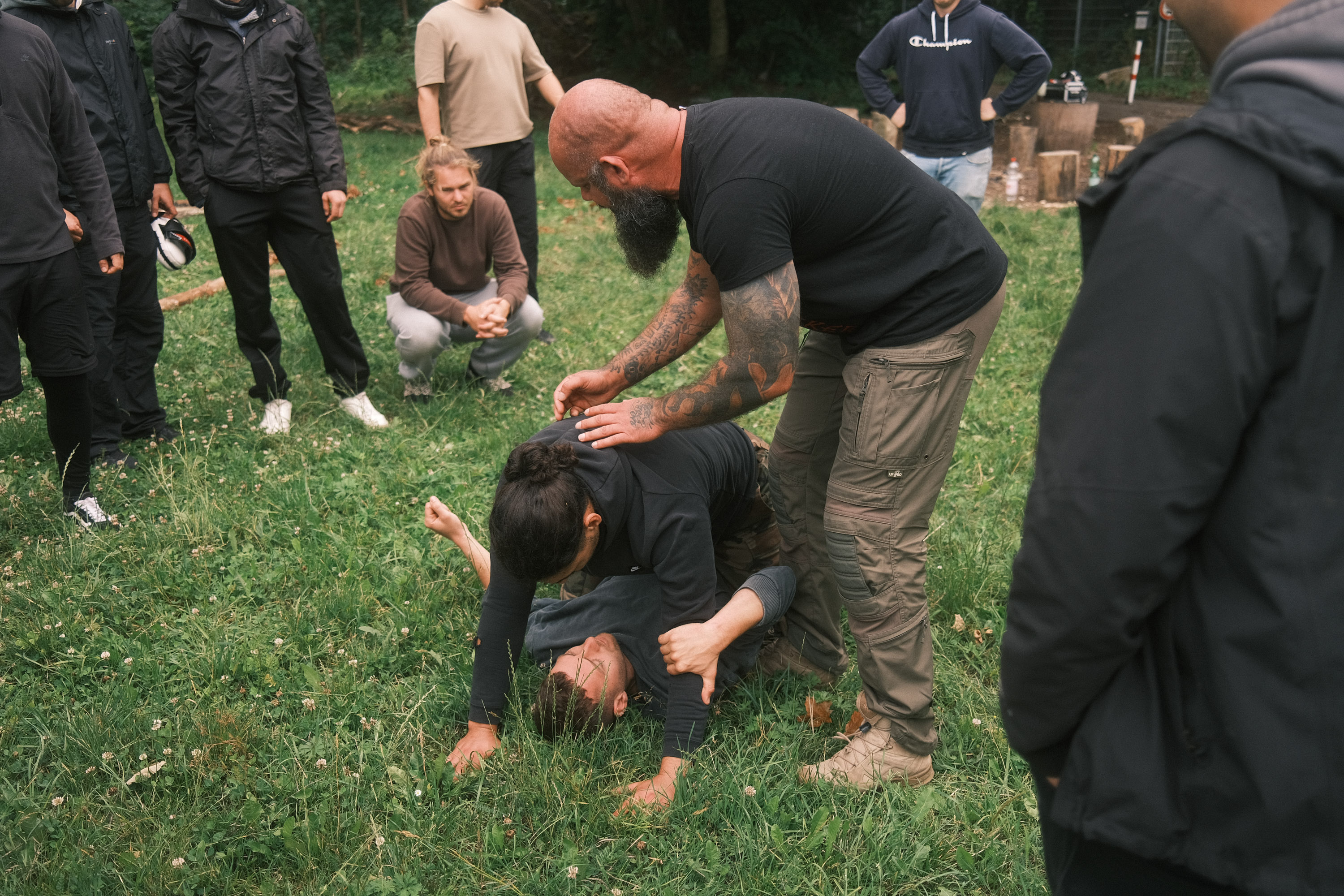 Ein Teilnehmer übt eine Kontrolle auf dem Boden, während andere zuschauen