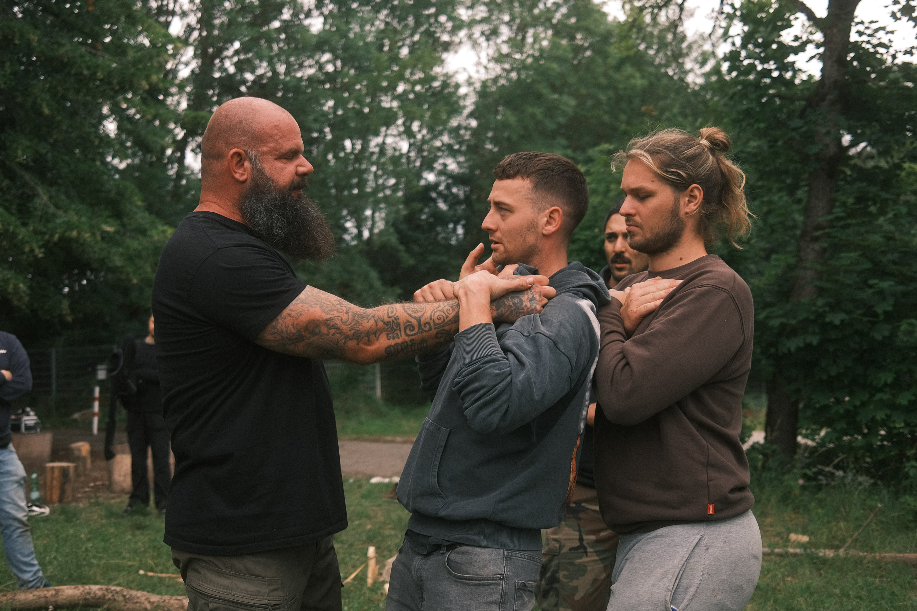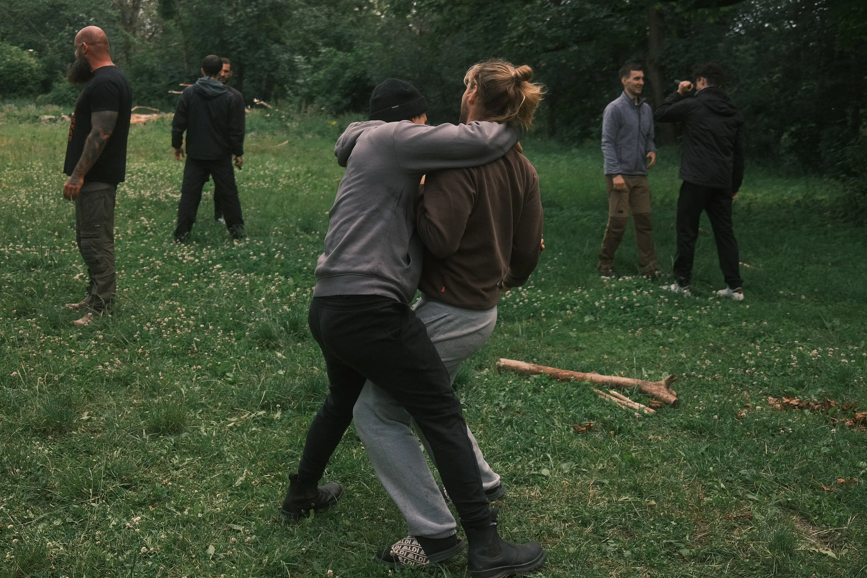 Ein Teilnehmer übt eine Technik zur Selbstverteidigung mit einem Trainer im Freien