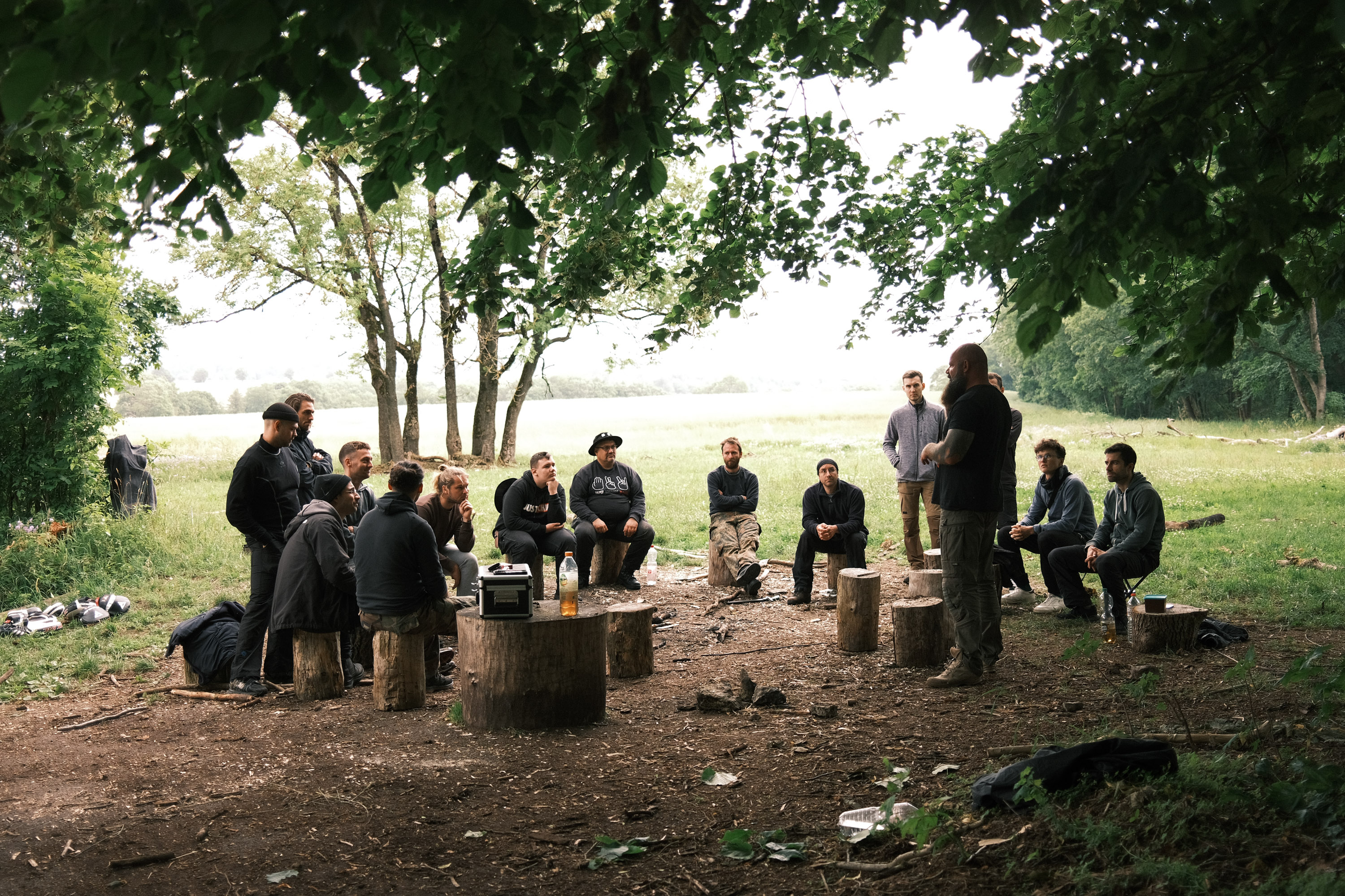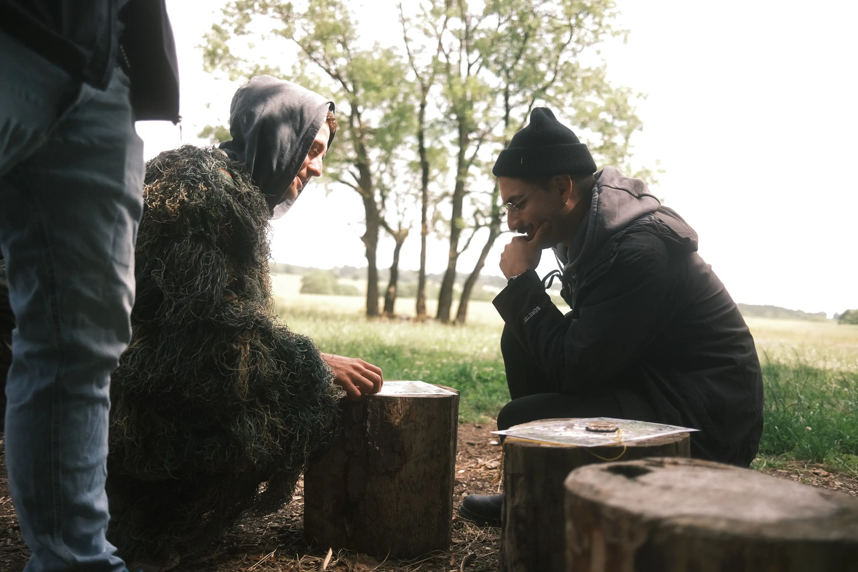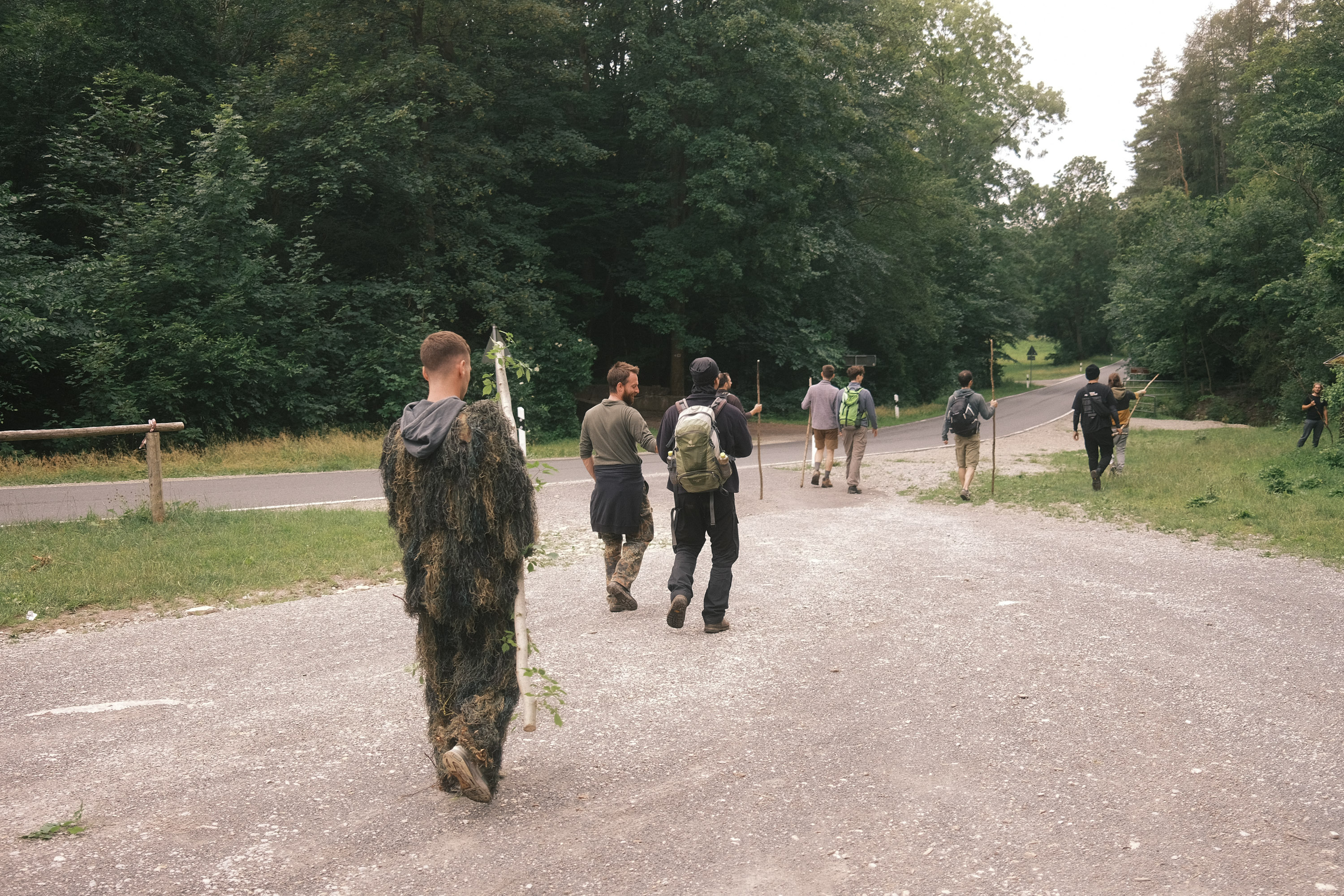 Gruppe diskutiert im Wald, einige tragen Tarnkleidung und lächeln