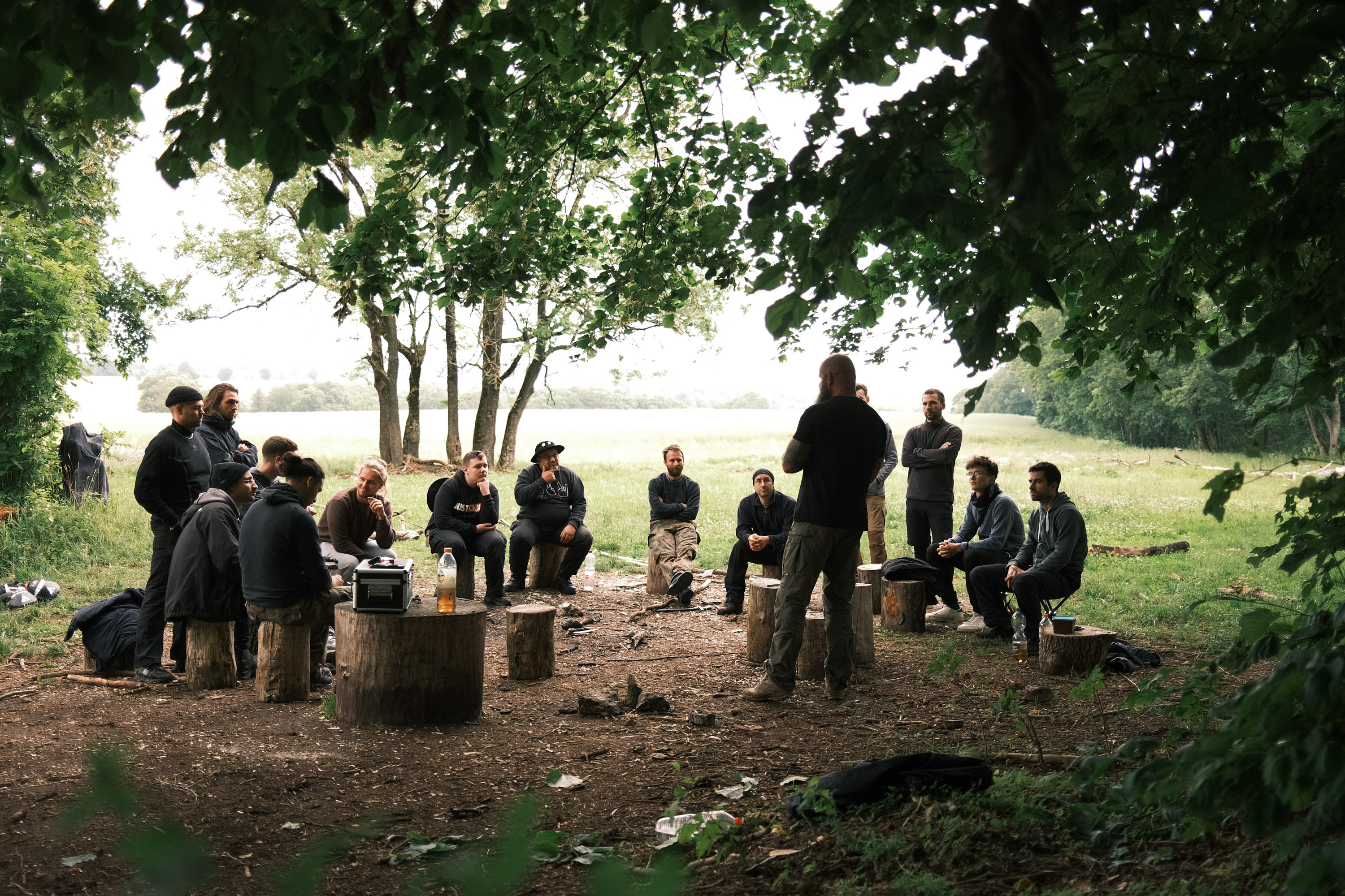 Mann erklärt Techniken im Freien, umgeben von Zuhörern auf einer Lichtung