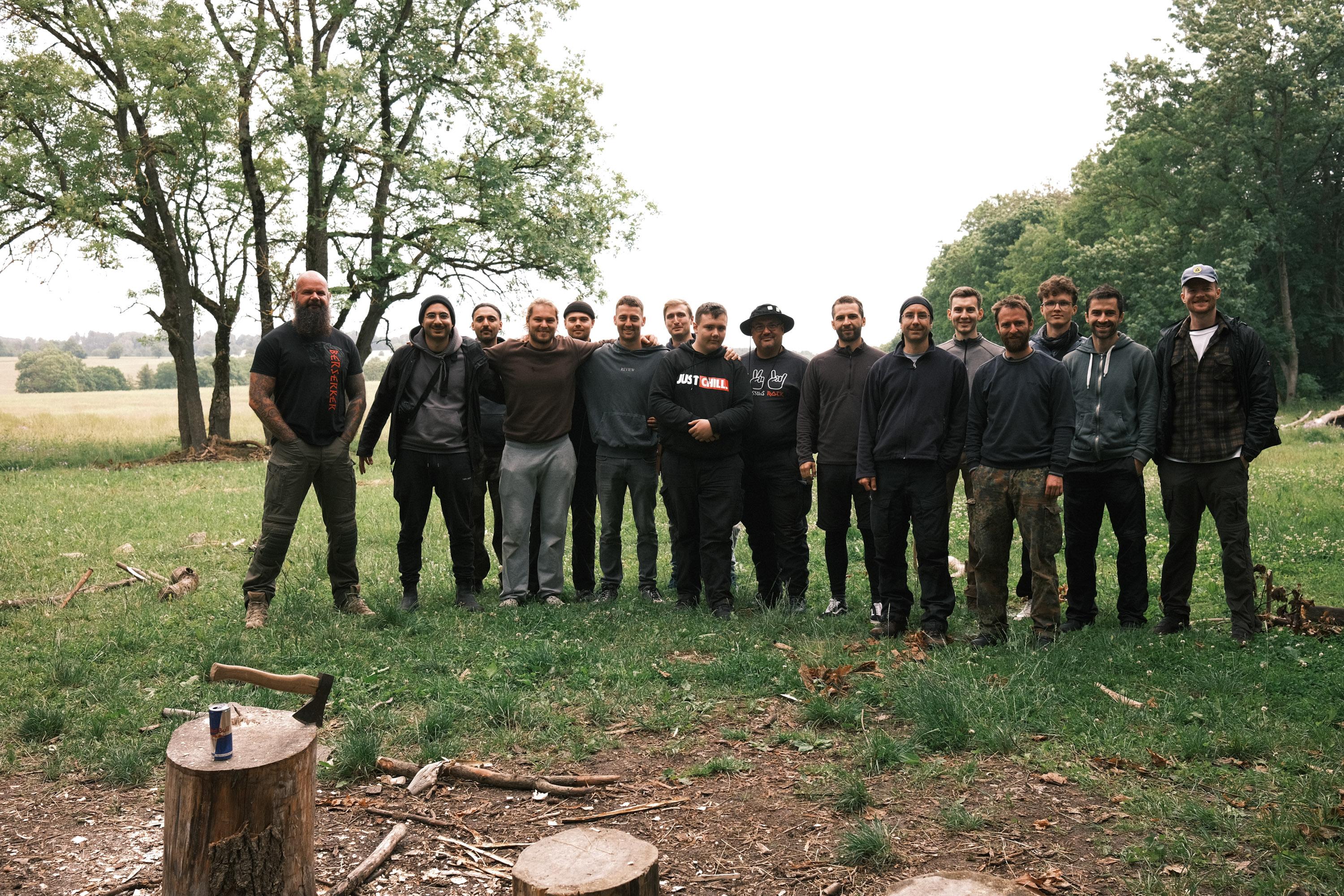 Gruppe von Personen steht auf einer Wiese, umgeben von Bäumen und Holzstämmen