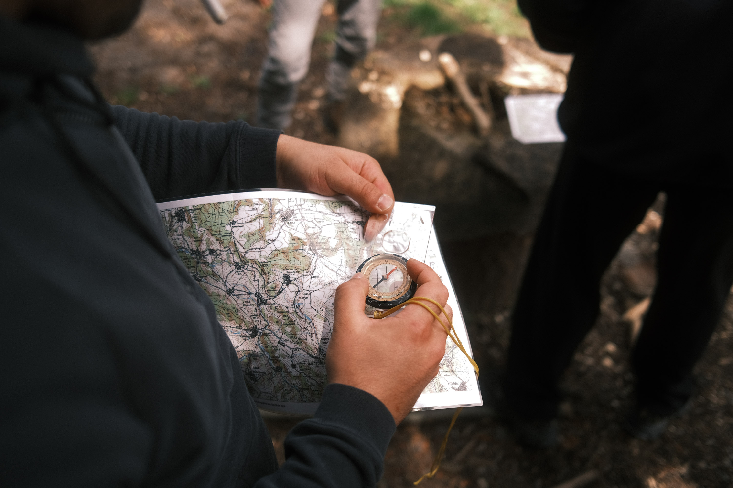 Karte wird mit einem Kompass zur Orientierung genutzt