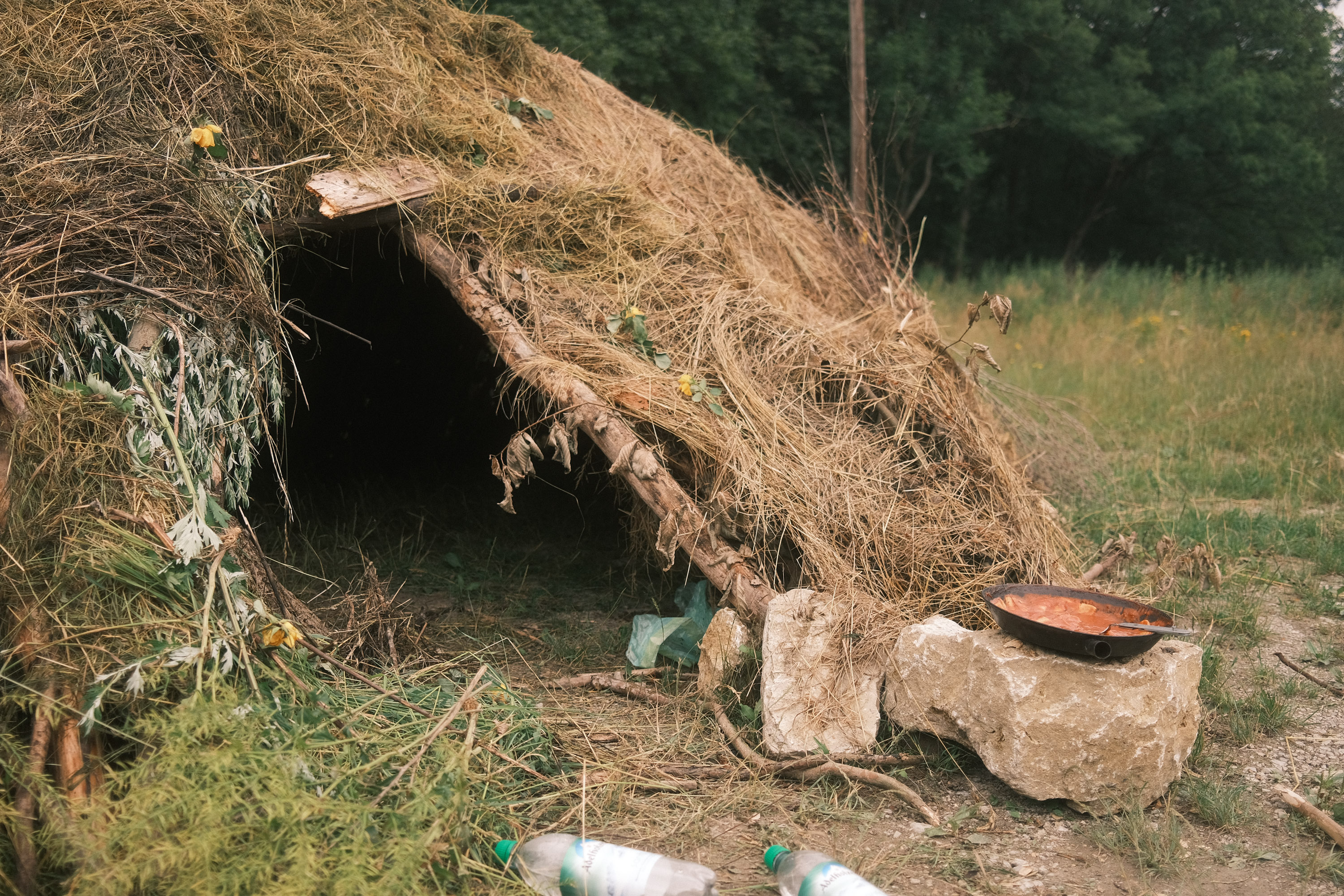 Laubhütte aus Ästen und Gras in einer offenen Fläche