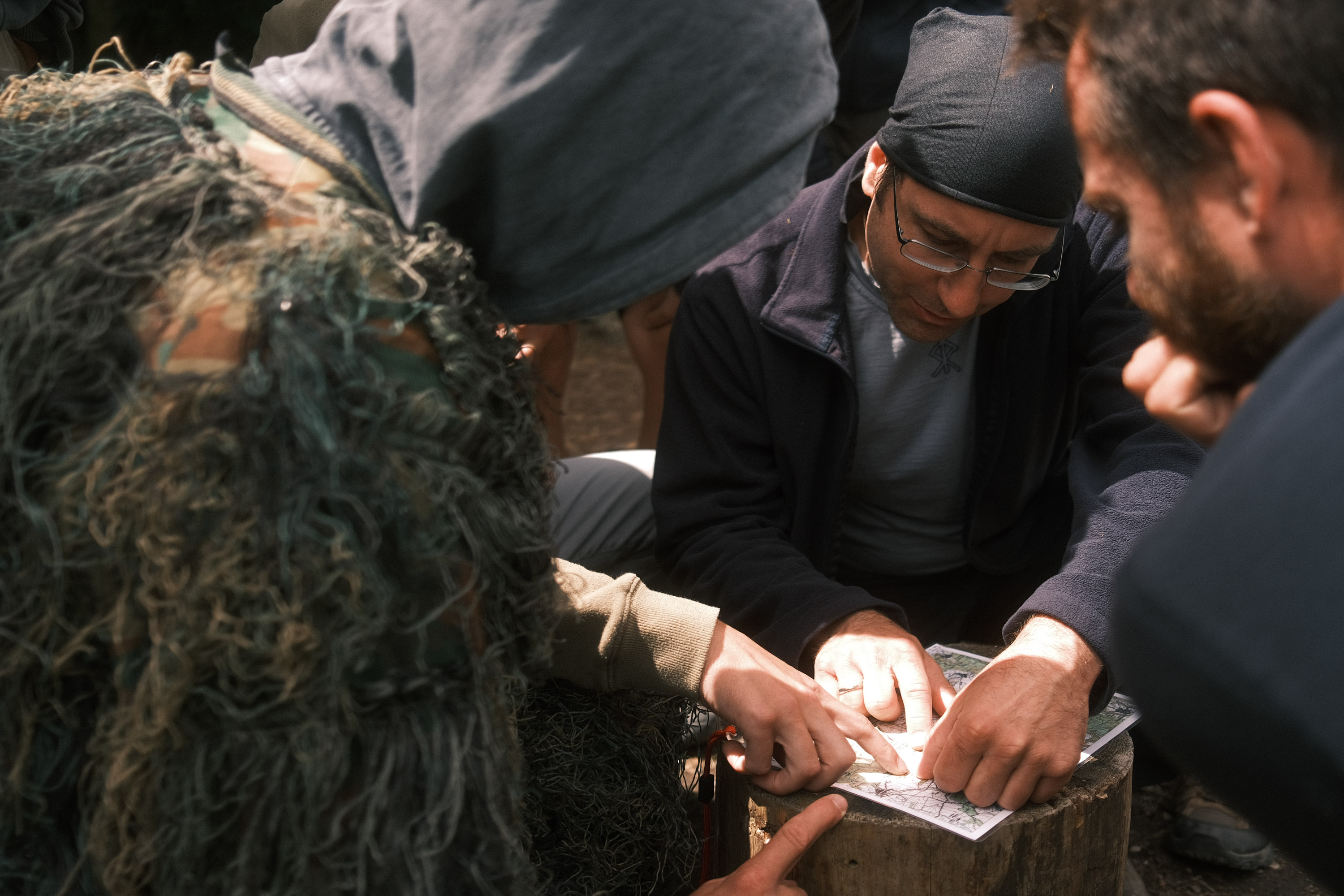 Kartenleser hält eine Karte, während andere Teilnehmer mit Stöcken stehen