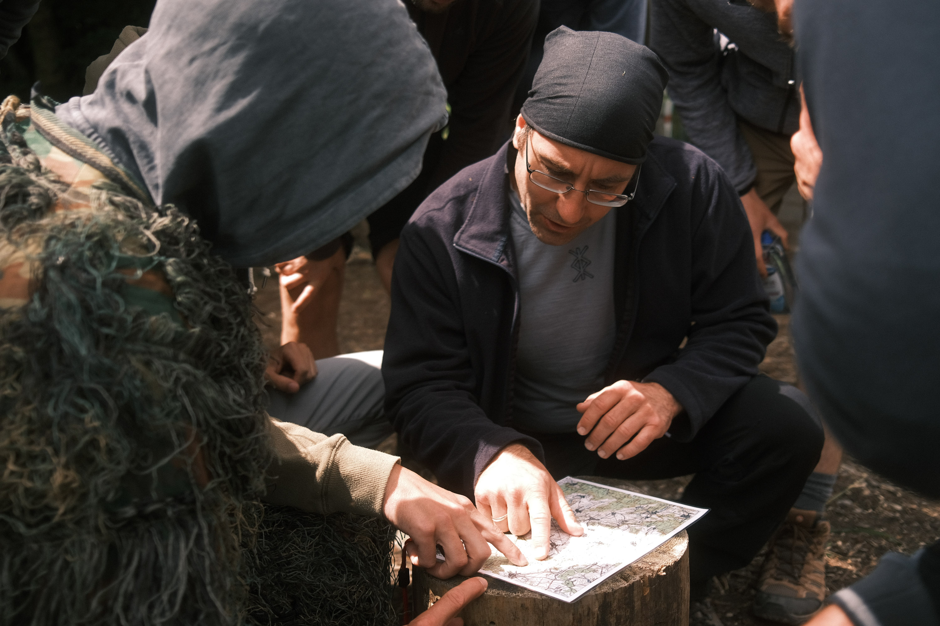 Mann mit Bart erklärt einer Gruppe im Waldgebiet eine Technik