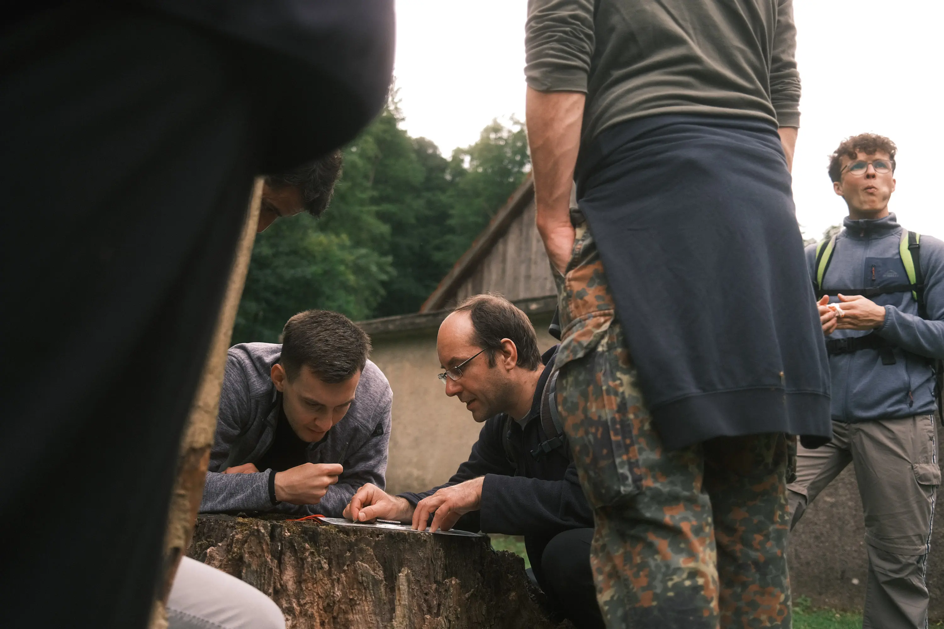 Zwei Personen untersuchen eine Karte auf einem Baumstamm, während andere zuschauen