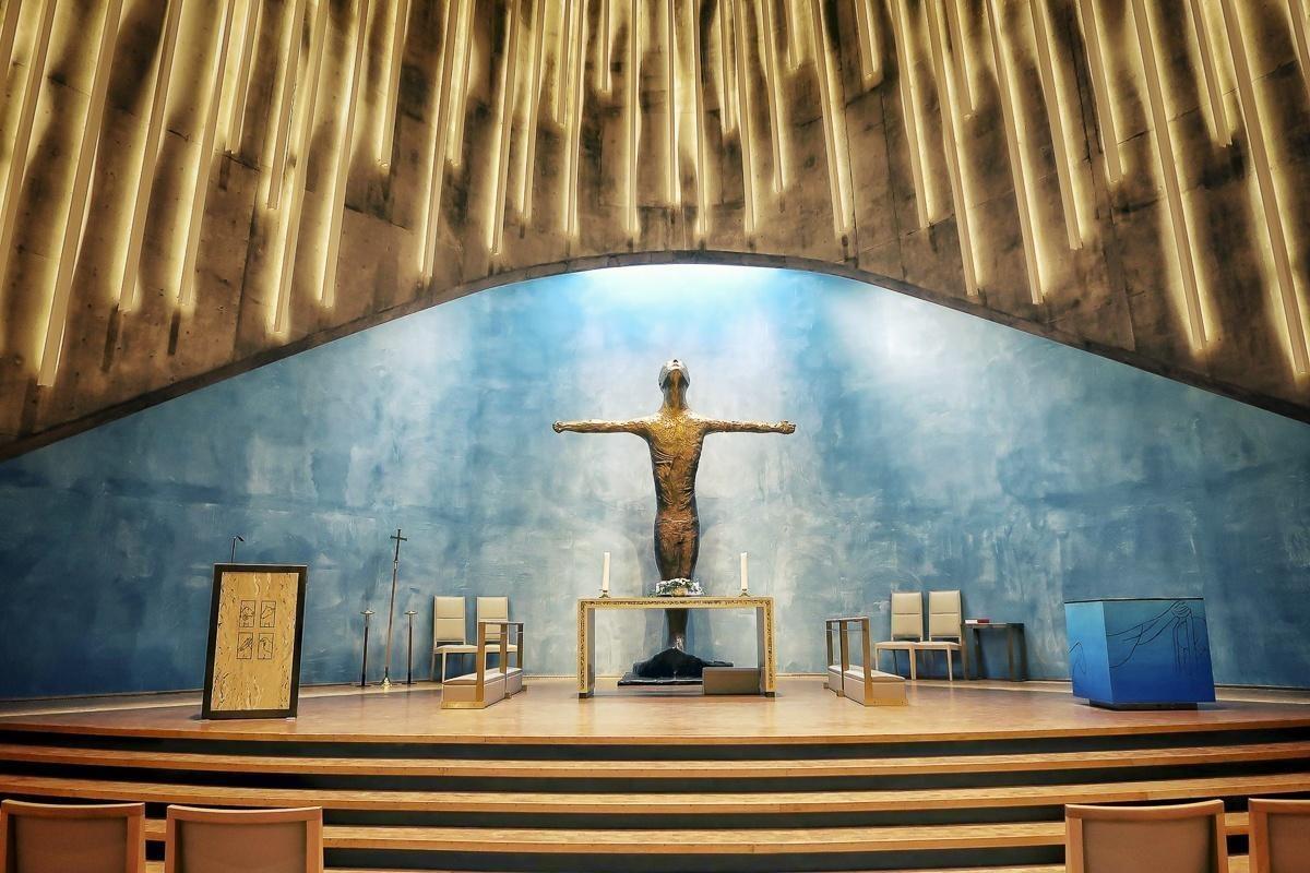 Skulptur eines menschlichen Körpers mit ausgebreiteten Armen vor einem Altar