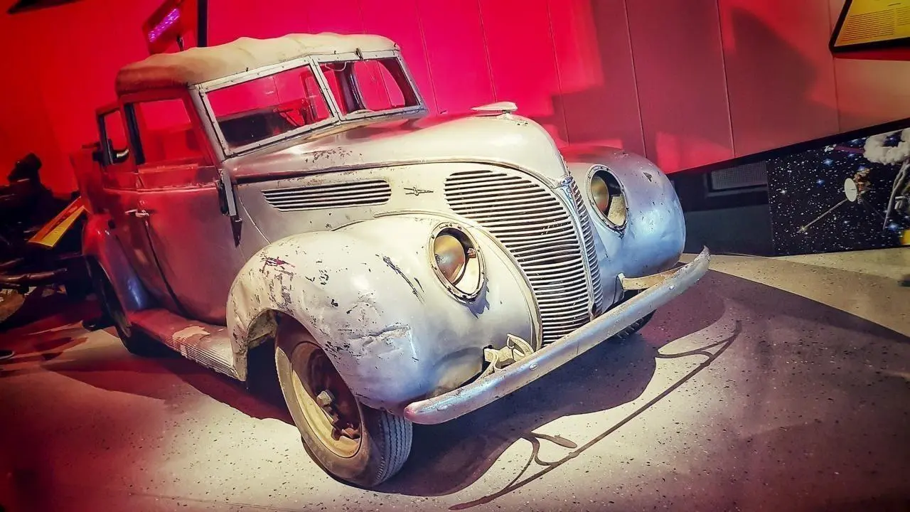 Oldtimer in gelber Lackierung steht auf einer Wiese