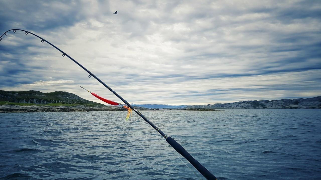 Angelrute mit Köder über Wasser, im Hintergrund Wolken und Küstenlinie sichtbar